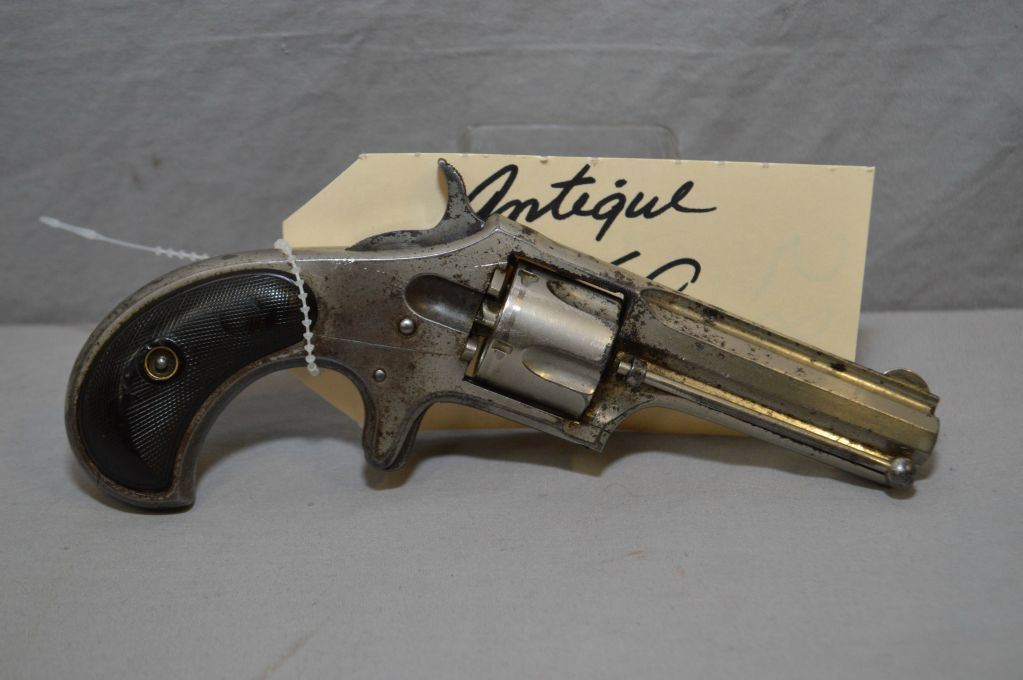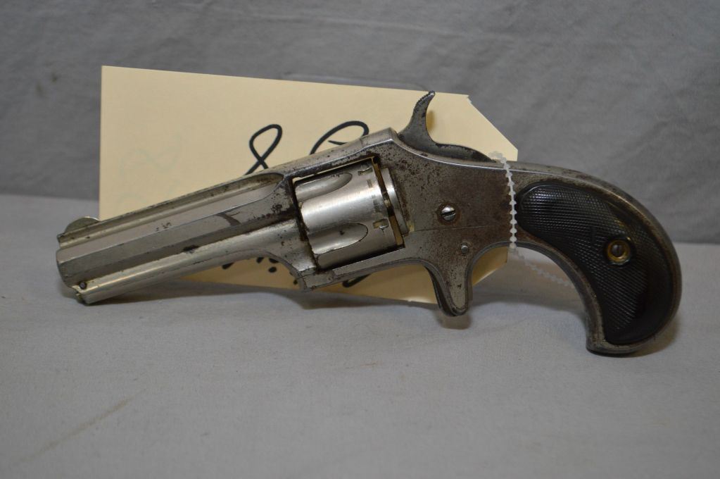 Remington - Smoot Model New Model No.2 .32 Rimfire Short Cal 5 Shot Revolver w/ 2 3/4" octagon ribbed bbl forged integral with frame [ flaking nickel finish, spur trigger, hard rubber checkered bird's head grips, with extractor rod, barrel markings " E.Remington & Sons, ILION, N.Y. Patented W.S. Smoot Oct. 21,1873" Approx. 1400 Production of this model and caliber, Circa 1877 - 1885 ] Ser # 171 ANTIQUE NO PAL REQ