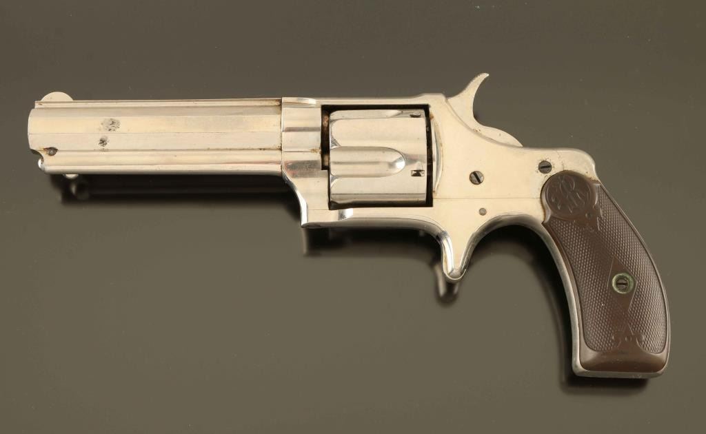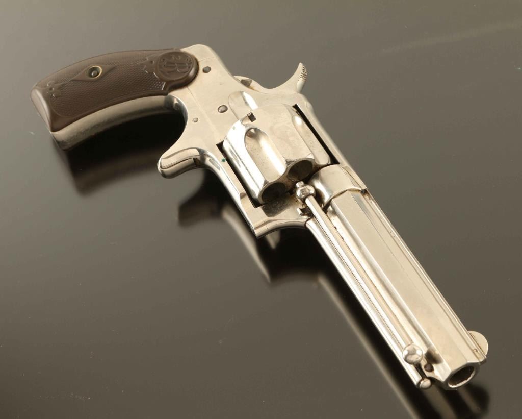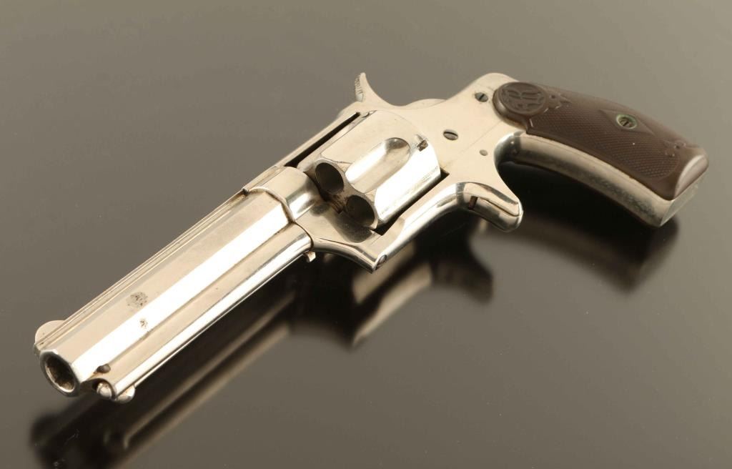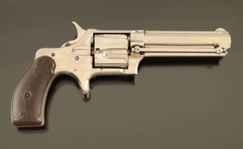 'Saw-handle style' Antique single action spur trigger revolver in the scare centerfire configuration, manufactured circa 1878-1888. Features a nickel plated finish, 3 3/4" octagon barrel with sighting rib, round blade front sight, 'u' notched rear sight, fluted five-shot cylinder, ejector rod, smooth trigger, knurled hammer spur, steel frame with 'saw-handle' grip and two-piece checkered hard rubber grips with "R" decor. Revolver exhibits approximately 96% nickel plating showing a couple small losses, some cloudiness & handling marks/superficial scratches. Action functions well, the bore is very good, markings are clear and the hard rubber grips are very good with "GJE' carved on the inside of the left panel. Condition is NRA Excellent. ***Antique Firearm***