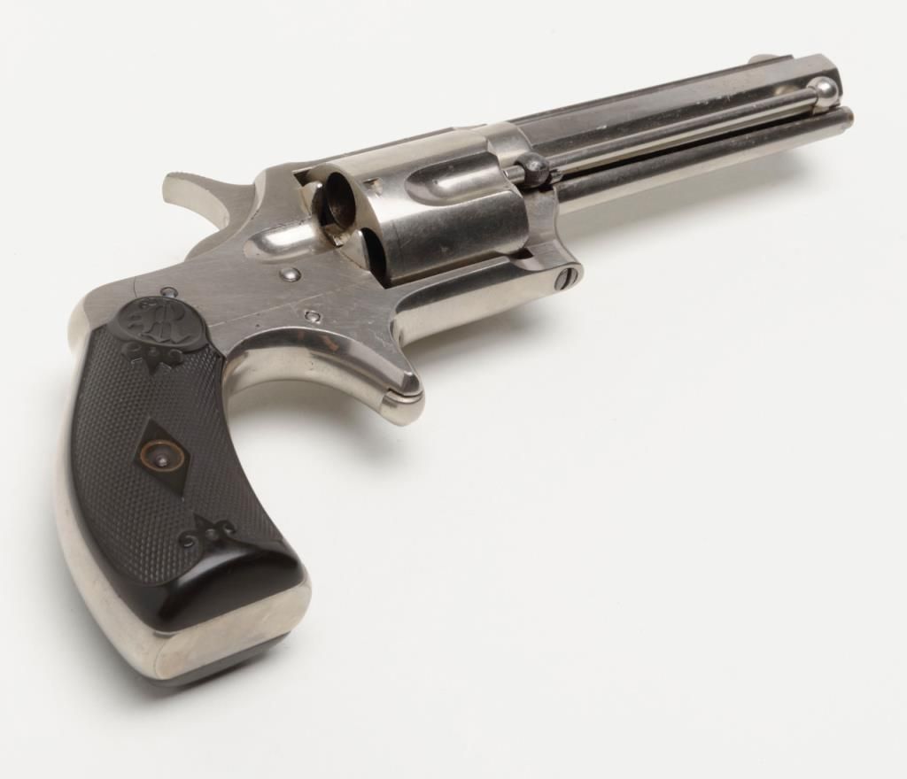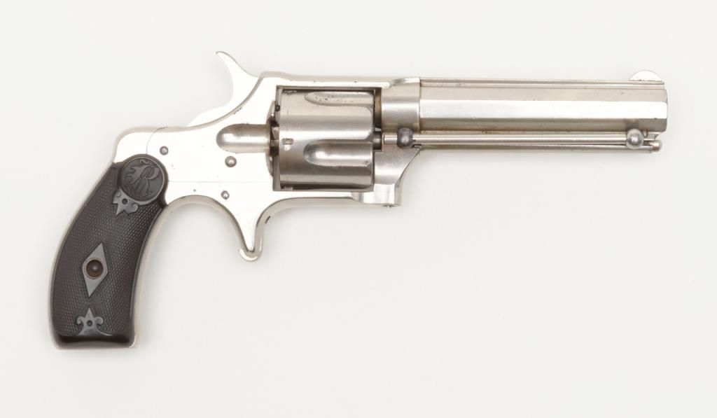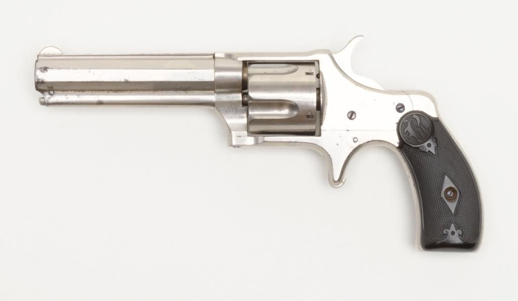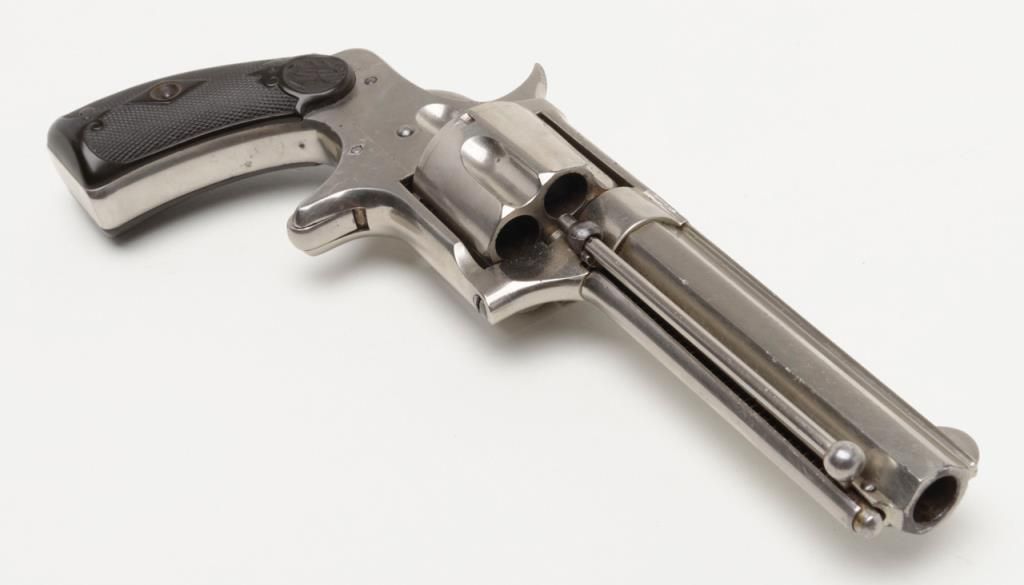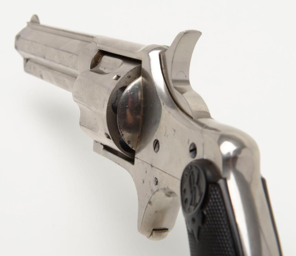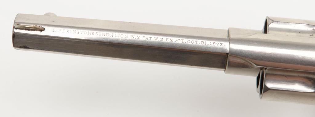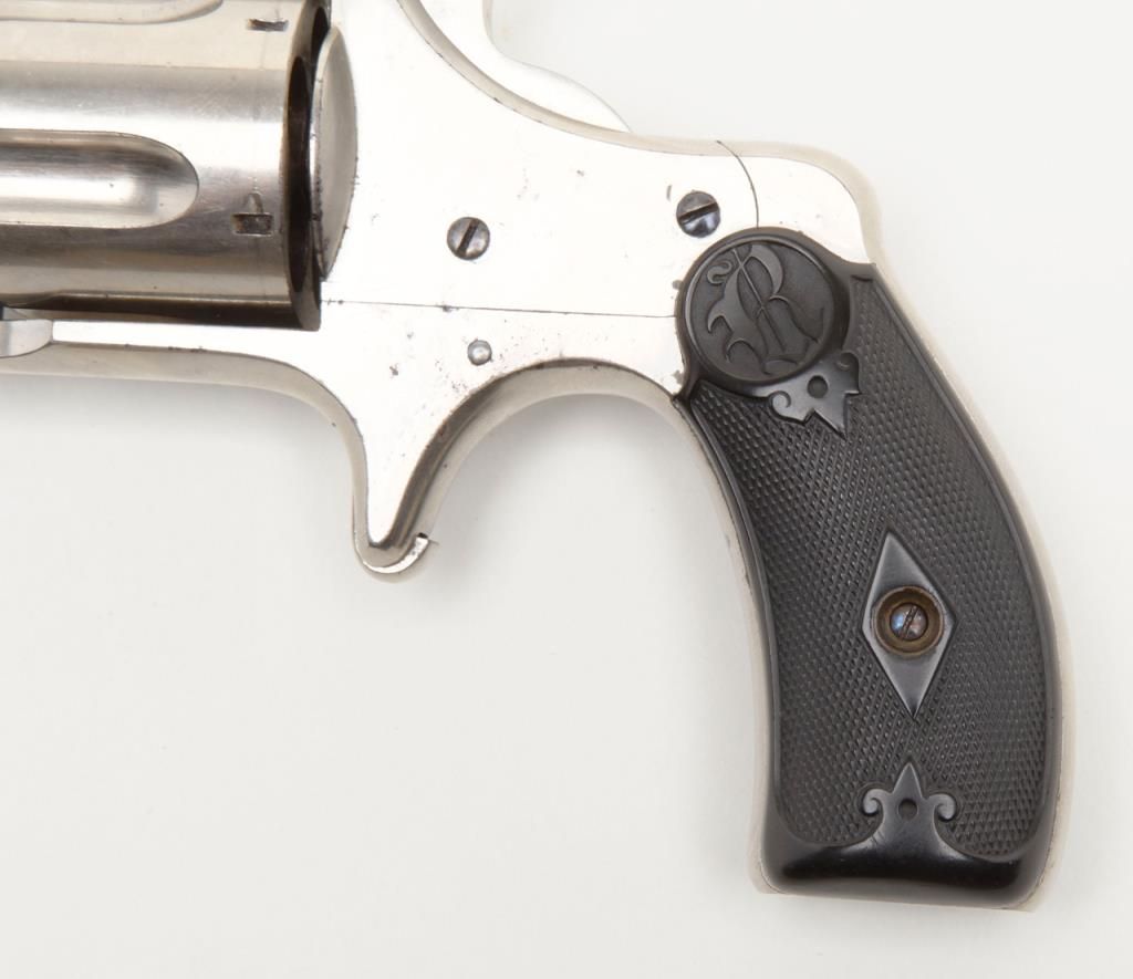 Remington-Smoot New Model No. 3 revolver, saw-handle style, .38 cal., 3-3/4” octagon barrel, nickel finish, checkered black hard rubber grips, #NVSN in overall fine condition showing the majority of its original finish, crisp action,very good + bore, fine grips, very good markings; accompanied by a green two piece cardboard box. (Antique). Est.: $300-$600.