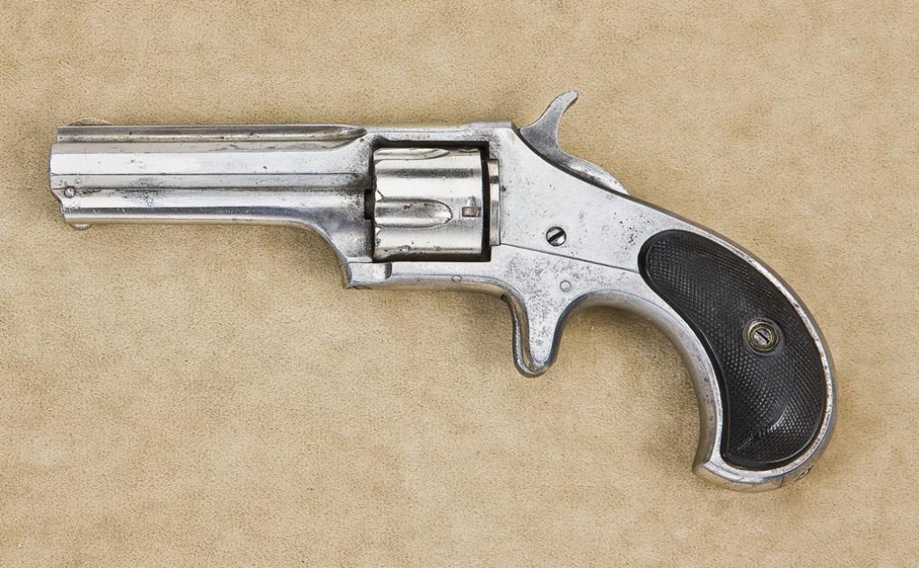 Remington Smoot spur trigger revolver, .30 cal., 2-1/2” barrel, nickel finish, checkered black hard rubber grips, #746. This gun is in overall fair + condition showing an old cleaning to metal surfaces, good action, bore should clean to good, grips are worn but overall good. Est.: $200-$400.
