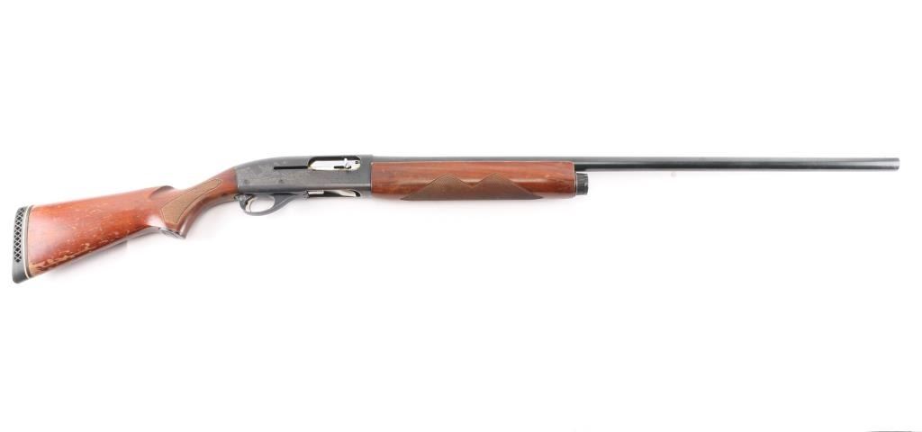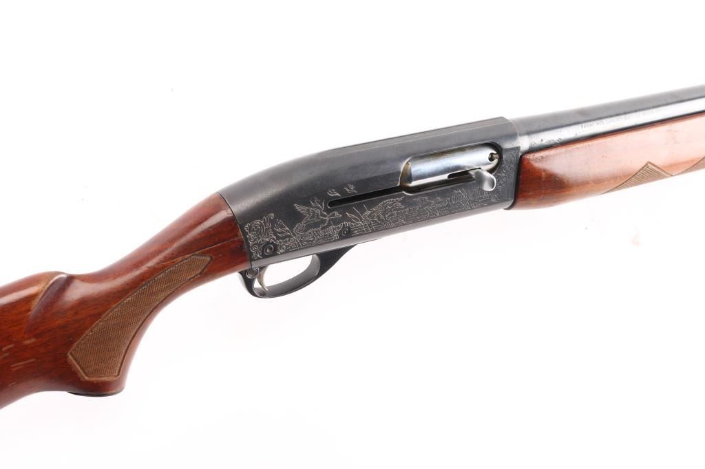 Vintage gas operated semi-automatic shotgun chambered for 3" 12 gauge Magnum shells, manufactured in Ilion, NY circa 1956-1963. Features a blued finish, 30” fixed full choke barrel, silver bead front sight, 3 round magazine tube, smooth trigger with beveled edges, push button safety, steel receiver with roll stamped game scenes, checkered walnut forend and semi-pistol grip shoulder stock with factory grip cap, recoil pad & 14” LOP. Shotgun retains approximately 75% of its original blued finish showing handling wear. Action is stiff with dried cosmoline, needs cleaning, the bore is very good and the wood stocks are sound with many scratches, and areas of finish loss.