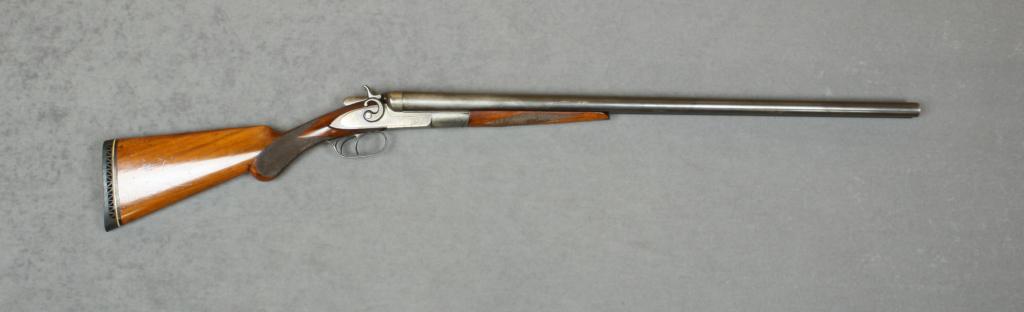 Remington SxS exposed hammers shotgun, 12 gauge, 28” barrels, blue and case hardened finish, checkered wood stocks, #103595. This gun is in overall very good + condition showing original blue in protected areas ofbarrels, approx. 40% original case colors on the receiver with balance gone to silvery finish, very good bores, crisp actions, sharp markings and very good wood with scattered nicks and mars from storage; added Pachmayrhard rubber butt pad. Est.: $400-$800.