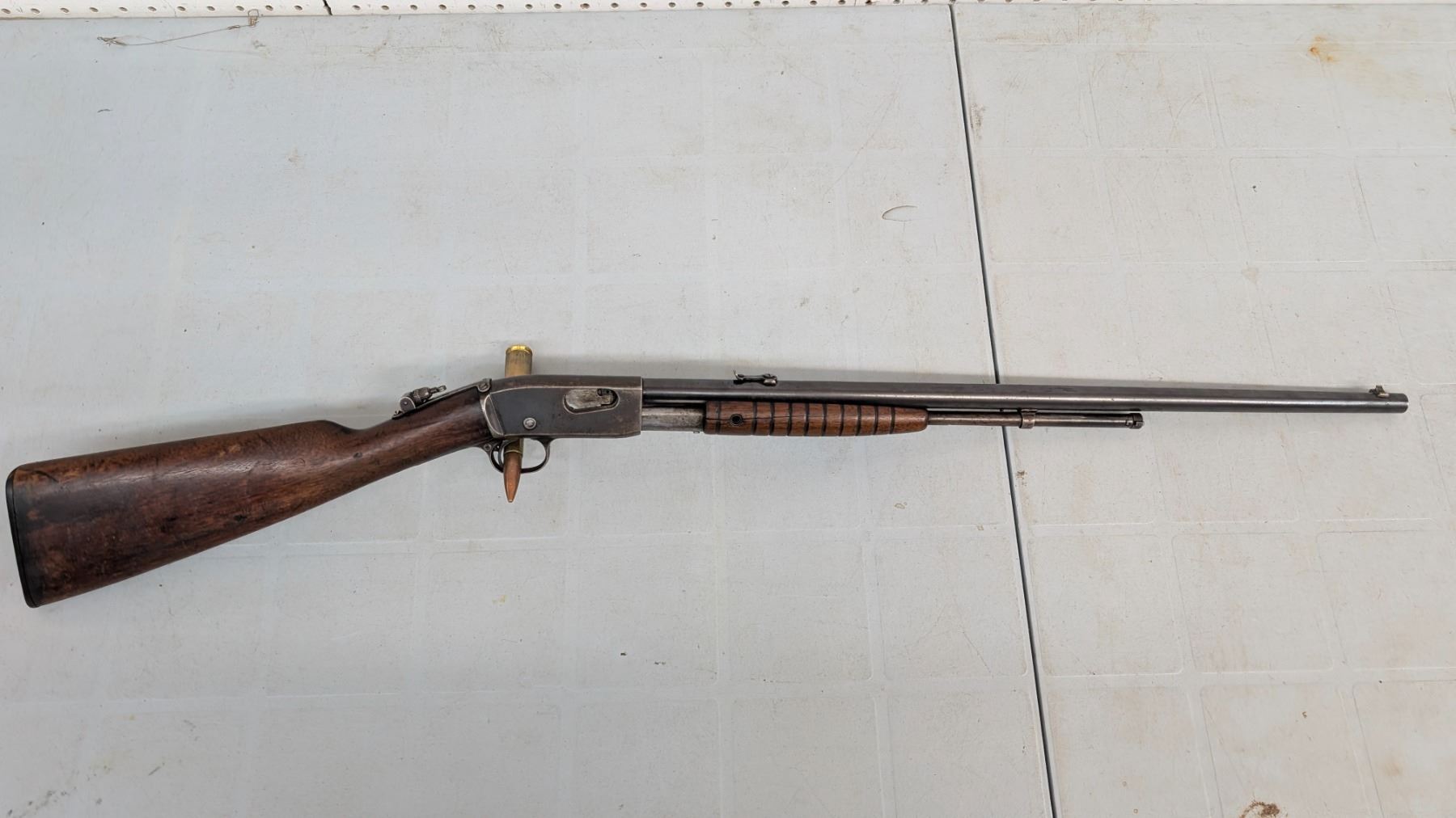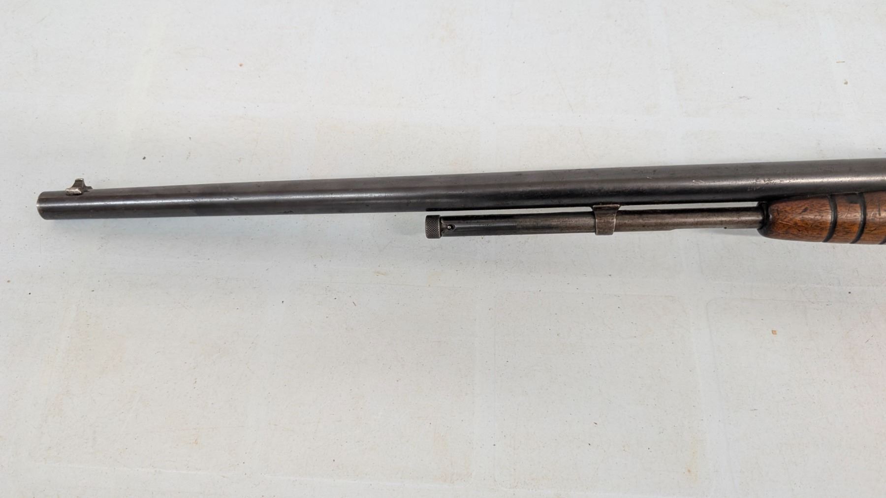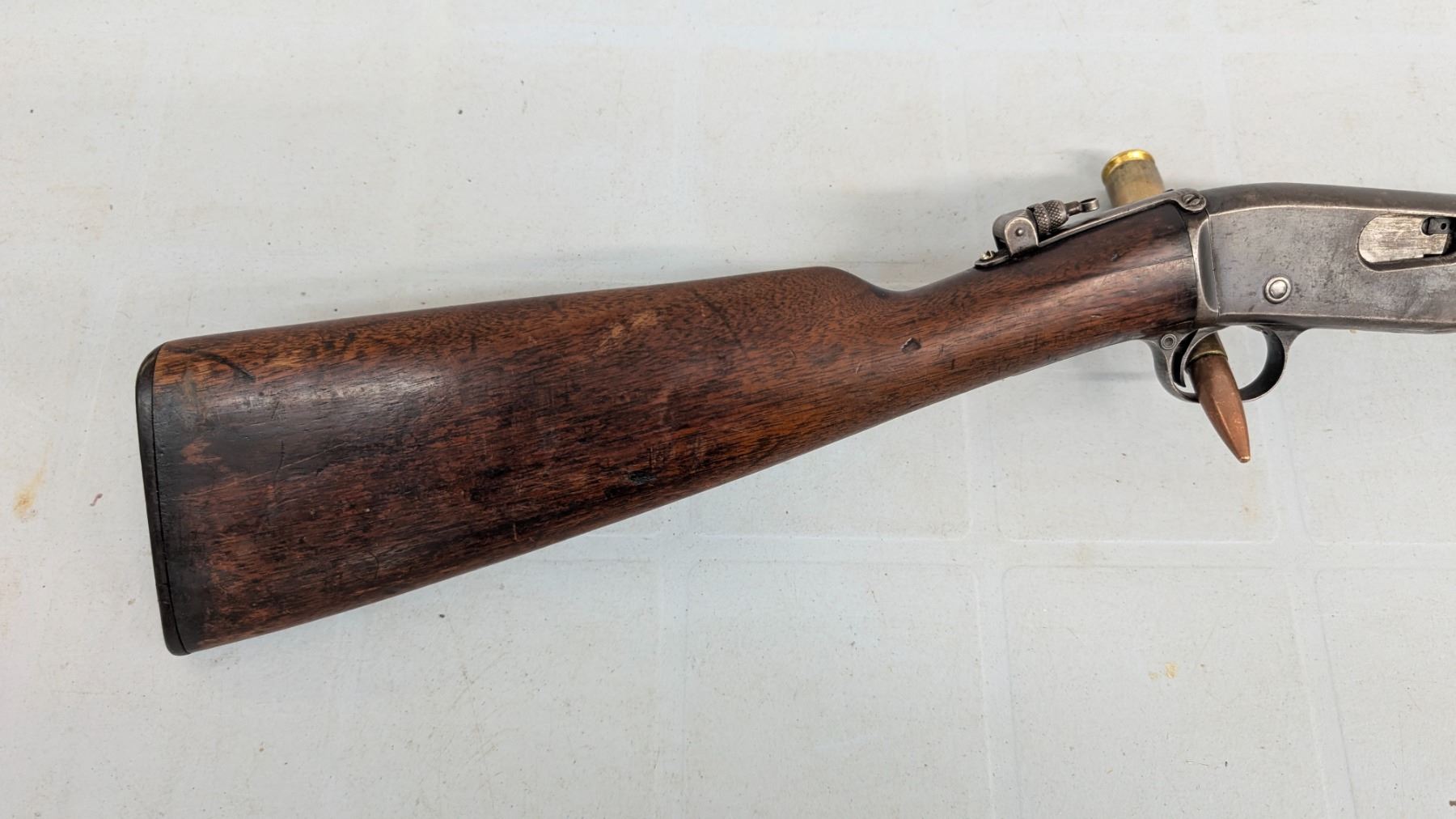 Pump action. Bore is shiny with strong rifling. Action functions well. Very little retained finish. Missing a screw from fore stock, and has a crack. Rear stock has a crack at the wrist. Rare Tang mounted Peep sight.