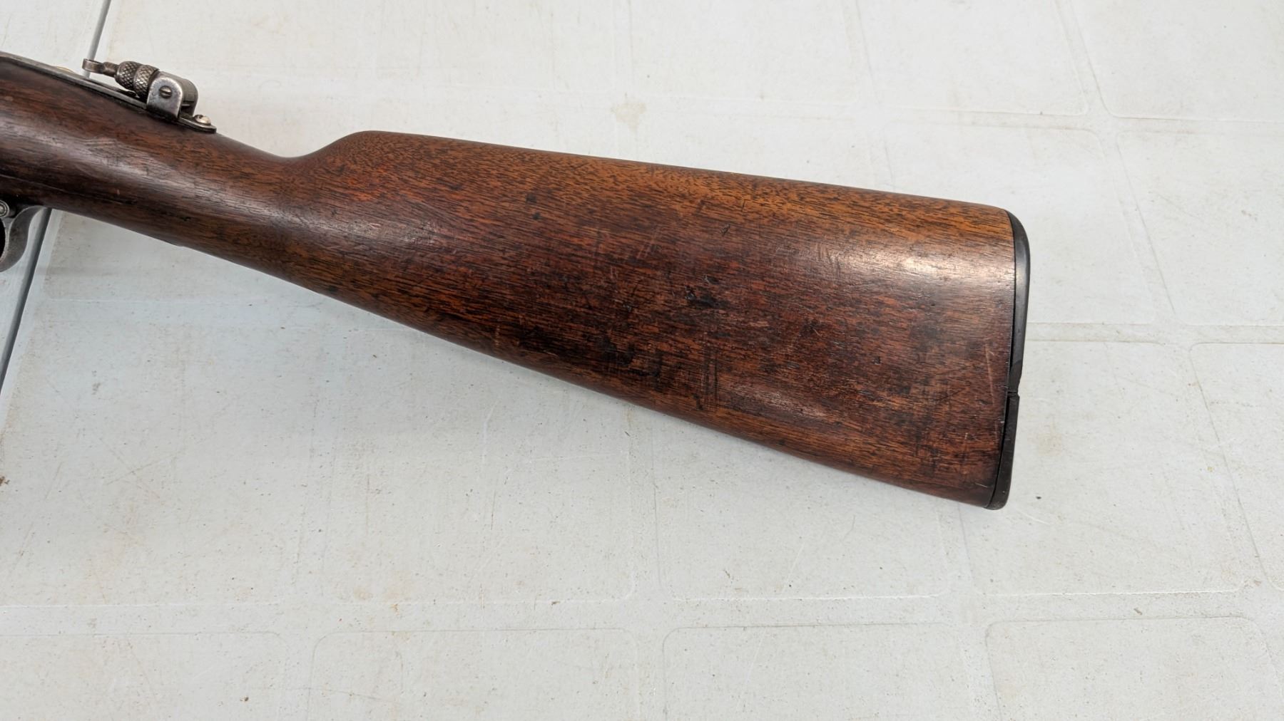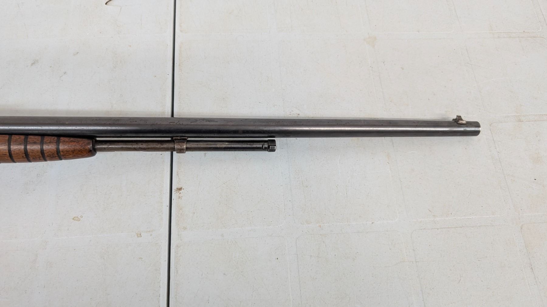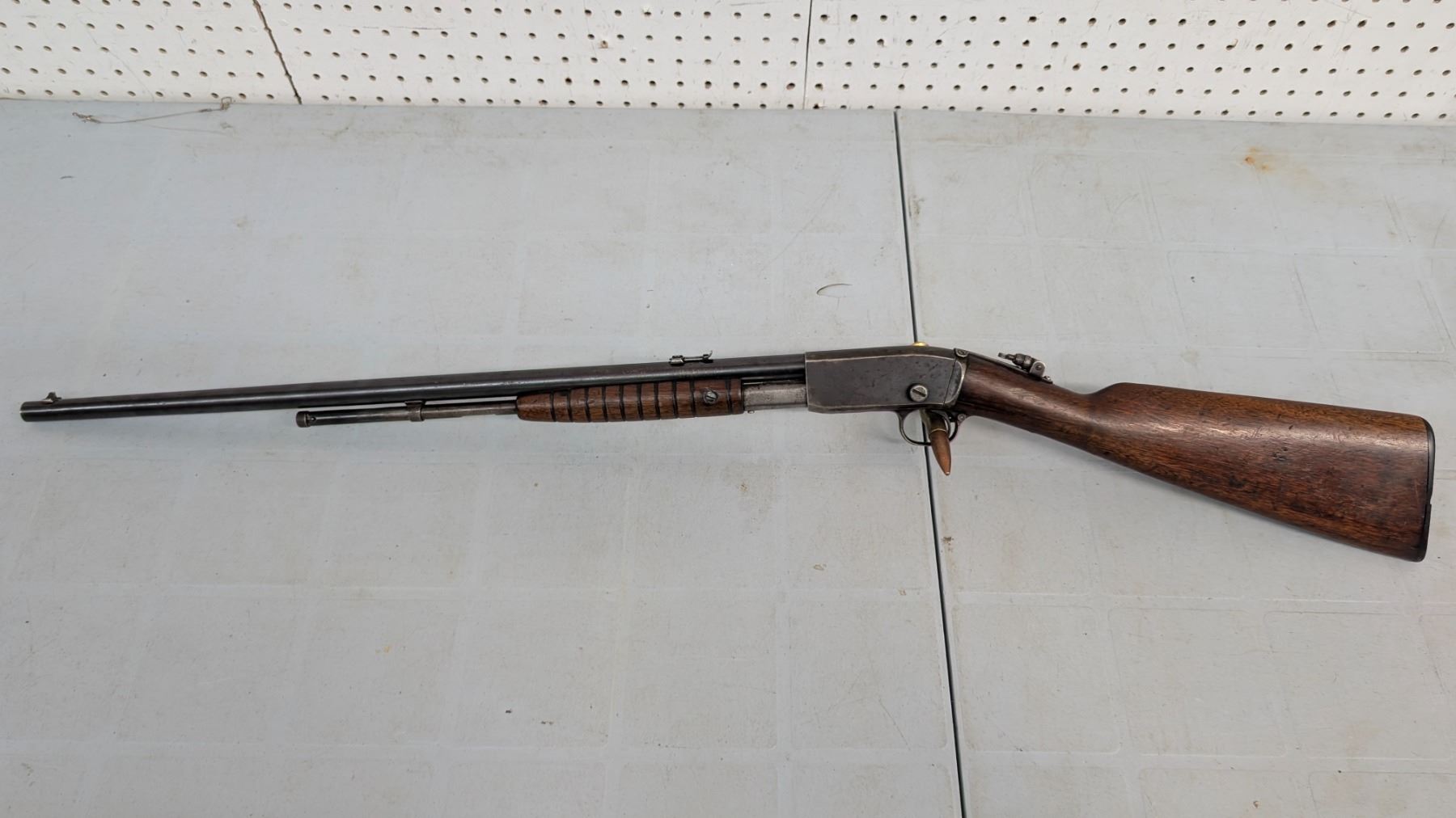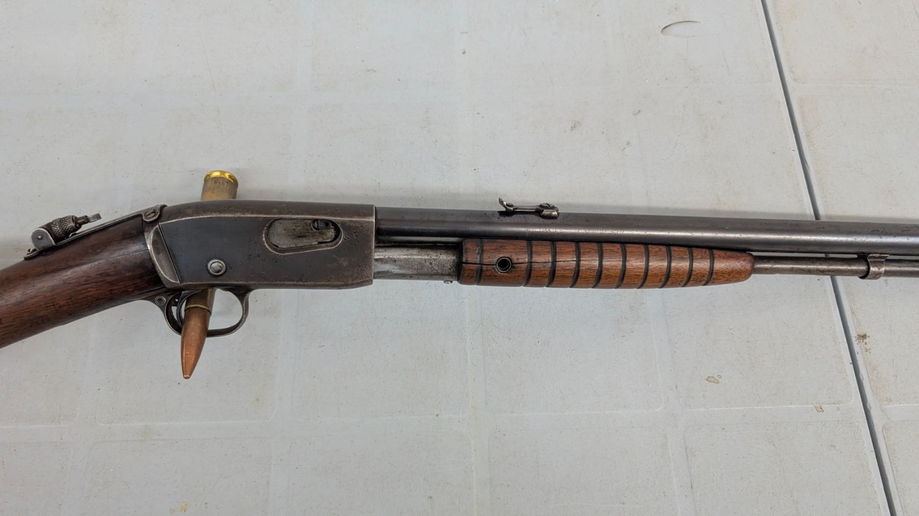 Pump action. Bore is shiny with strong rifling. Action functions well. Very little retained finish. Missing a screw from fore stock, and has a crack. Rear stock has a crack at the wrist. Rare Tang mounted Peep sight.