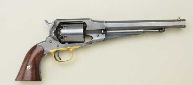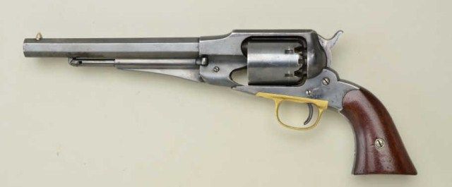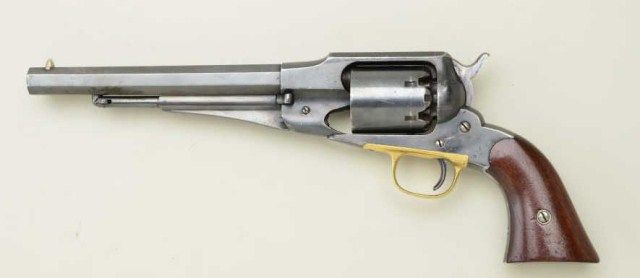 Remington Transitional New Model percussion revolver, martially inspected, .44 cal., 8" octagon barrel, blue finish, wood grips, #19325. This gun is in overall fine condition showing the majority of its originalmilitary finish, crisp action, fine bore, brass trigger guard, fine wood grips with majority of inspector's cartouche on the left grip. This variation is between the Model 1861 and New Model with barrel address absent the "New Model" marking. Est.: $2,000-$3,000.