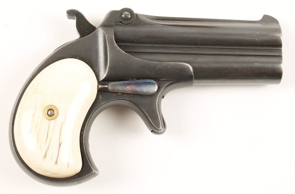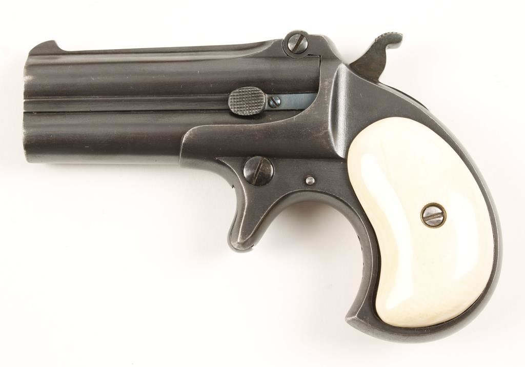 A presentation display case including the derringer and a T. L. Bish Bowie knife and scabbard. The pistol is a 2-shot over-under with a blued finish and ivory grips. The finish is a dark grey with minor edge wear. The bore on the 3" barrels are close to pristine with only a few small spots of discoloration. The knife has a 10" blade with nickel plated hilt and ivory scales (with one crack in each of the scales). There is a small nameplate with the makers name on the left scale. The scabbard is dark leather with nickel plated furniture at the opening, the tip, along the edge and halfway down the spine. The derringer is in very good condition. The knife is in excellent condition except for the cracked scale. The hardwood dovetailed box is lined with blue velvet and fitted with brass hinges and latches and is in good condition. *Modern Firearm*