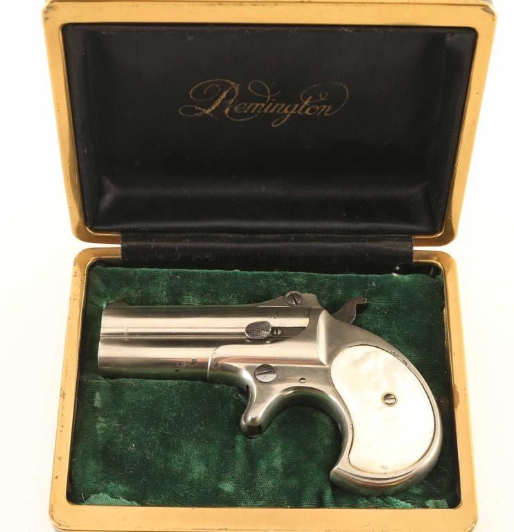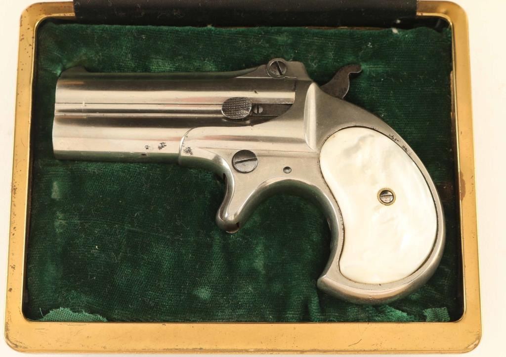 Over / Under Derringer chambered for 41 Rimfire, manufactured between 1888 - 1911. Features 3" barrels, fixed sights, manual extraction; barrel flips up to load/unload. Bores are in very good condition with strong rifling and a light ring of pitting near muzzle. Nickel finish is 90% with some flaking in spots, particularly under barrel, around hinge, and by left grip; muzzles show much bare metal on forward flats; some roughness under nickel at base of grip. Case color hammer and trigger are very good. White pearl colored grips are very good condition. Includes a good condition French fitted jewelry style case with spring tension closing, green velvet lined inlay, black cloth lined lid with "Remington" in gold color letters. Outside of case is black leatherette with gold color metallic edging and blank brass plaque in lid. Ammunition included: 2 rounds each of "U" head stamped Remington and "Diamond" head stamped Winchester ammunition; all copper cased with pointed lead bullets; Winchester bullets are copper plated or washed, Remington bullets are dark colored lead. Condition is NRA Very Good ***C&R Firearm***