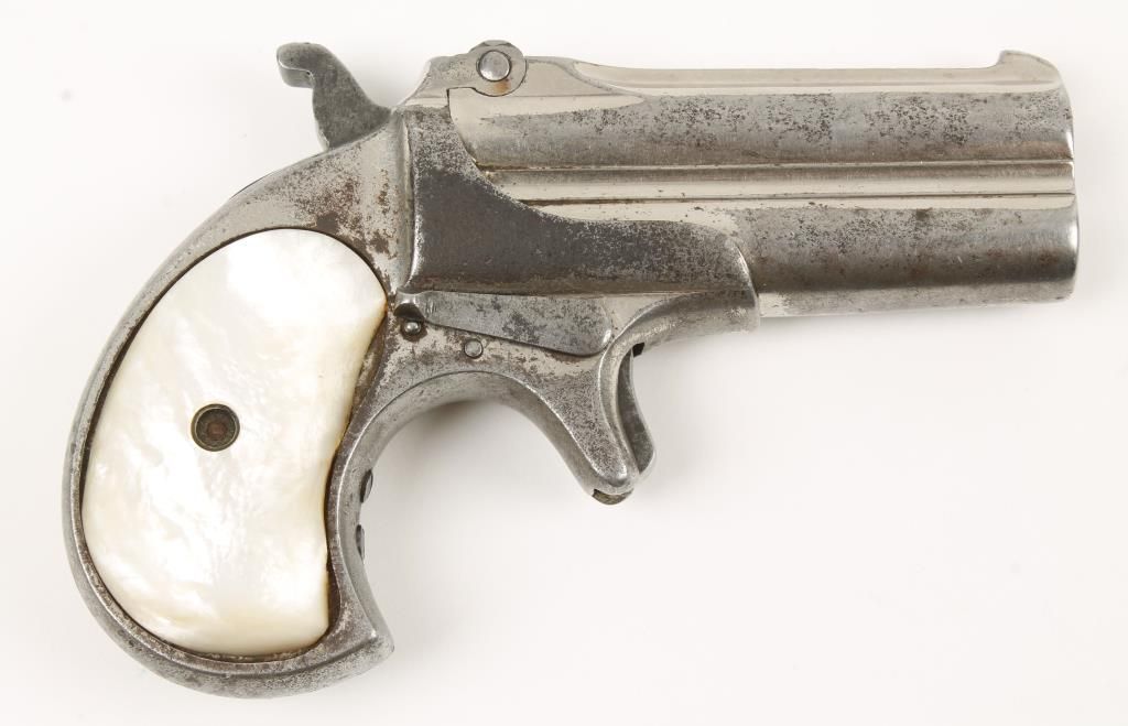 Later model over under derringer with 3" barrels. Nickel finish, mother of pearl grips, spur trigger and fixed sights. Hinge shows repair expertly done. Top of barrel stamped "Remington Arms-U.M.C. Co. Ilion N.Y." Fair bores and good working action. Condition: Fair to good showing 70% original nickel, mother of pearl grips show shrinkage but are very good. *Curio & Relic Firearm*