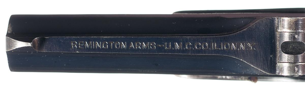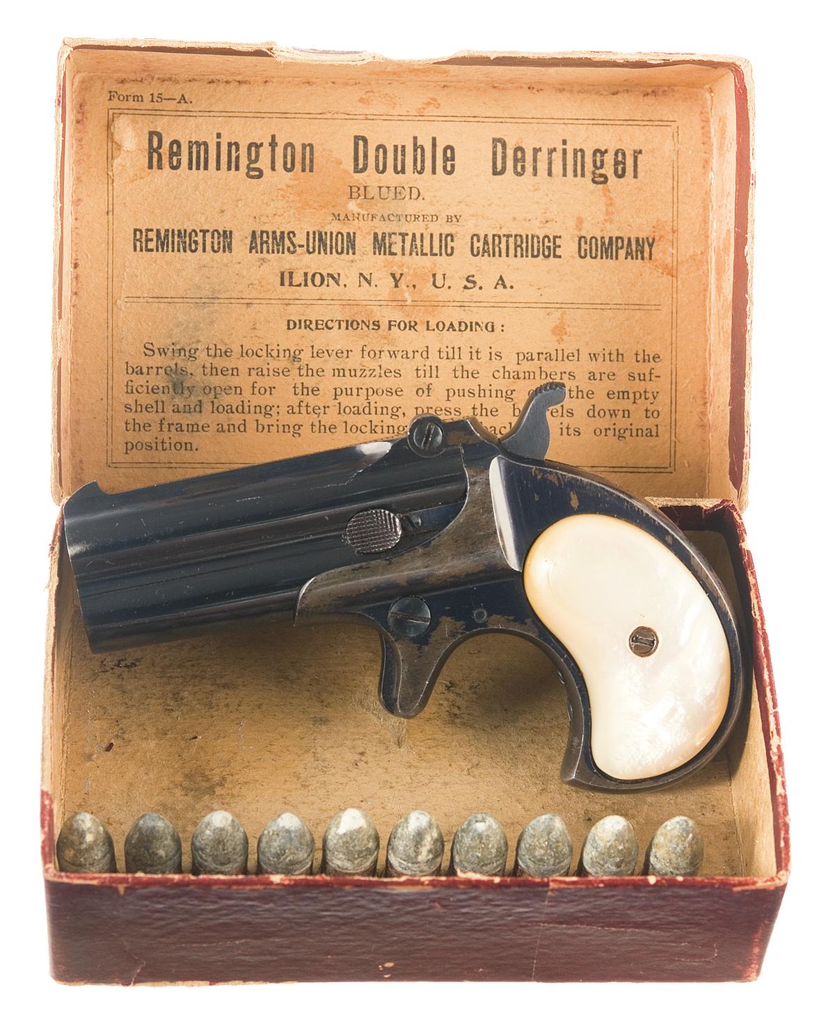 Manufactured from 1912 to 1935, the top of the barrel rib is marked "REMINGTON ARMS - U.M.C. CO. ILION, N.Y." and the serial number is on the bottom of the barrel. The derringer is fitted with smooth two piece pearl grips. Complete with a scarce two piece original maroon factory box with end label that rears "Remington - UMC / DOUBLE DERRINGER / BLUED .41 Cal. Short Rim Fire / REMINGTON ARMS WORKS. ILION, N.Y., U.S.A." on the Remington UMC circle to the left. The inside of the lid has the correct "Directions For Loading" label. Also comes with 10 original 41 caliber short rimfire cartridges with "U" head stamp.
