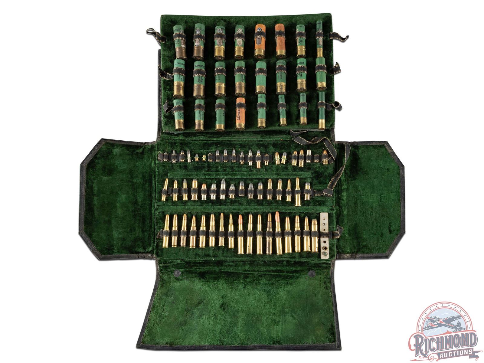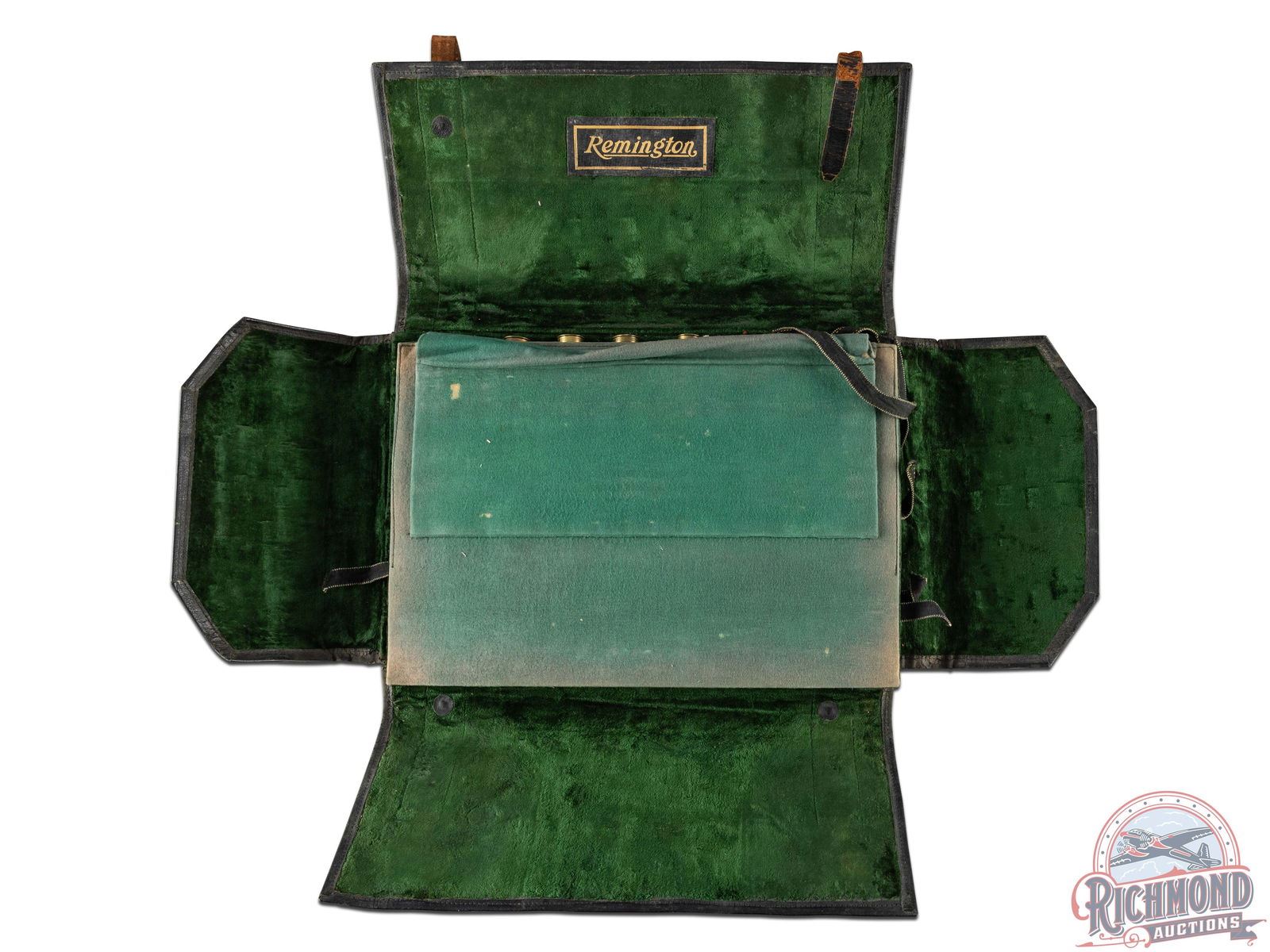1920's Vintage Remington U.M.C. Dummy Cartridge Salesman Sample Kit with roughly 25 paper shotshells of the period and approximately 50 Rem-UMC head stamped lacquered rifle and pistol rounds housed in fold out leather satchel with green felt lining and "Remington" label.