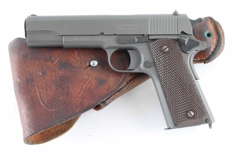 Pistol. Semi-Automatic. +1 Capacity. 1918 Remington Arms-UMC frame Re-built in WW2 using Remington Rand slide. 5" barrel, fixed blade/notch sights. Gray parkerized "Wartime" finish. Flat, smooth, mainspring housing with lanyard ring attached. Diamond checkered reinforced brown plastic grips. Left slide stamped with 2-line Remington Rand Address. Left frame stamped "United States Property. Left triggerguard stamped with "E" Inspectors stamp E.E.C. stamped below the slide stop. (Edmund E. Chapman) Right frame stamped with serial number. "U", and "G", stamped under the firing pin stop on the slide. Barrel stamped with "P" and "HS". Bore is excellent/bright. Slide action is smooth/tight. Grips are excellent. Metal finish is about 98%, with some very minor scratches/rubs. Comes with a "US" brown leather flap holster. Marked "U.S." Graton & Knight Co. 1943" NRA Condition-Excellent. C&R Firearm.