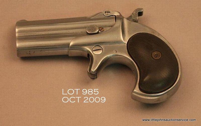 Remington-UMC O/U derringer, .41 cal., 3” barrels, checkered hard rubber grips, #276. This gun is in overall good condition showing an old cleaning to the frame and barrels, good bore, good action and markings, old repair to barrel hinge, worn buoverall good grips. Est.: $200-$400.