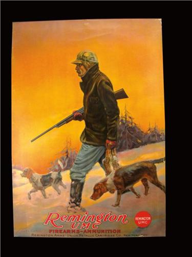 Remington UMC Firearms and Ammunition Paper Poster, original bands top and bottom. J. Eads Collins artist depicting snow scene with hunter carrying rabbits. Framed and matted. Minor crease on hat and edges otherwise excellent original condition. Image 18 X 26 inches.