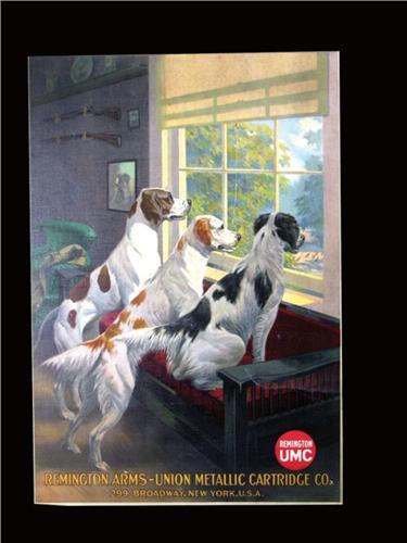 Remington UMC Paper Poster, depicting three dogs looking out the window. No bands, minor tears otherwise excellent original condition. Framed and matted. 15 1/2 X 22 1/2 inches.