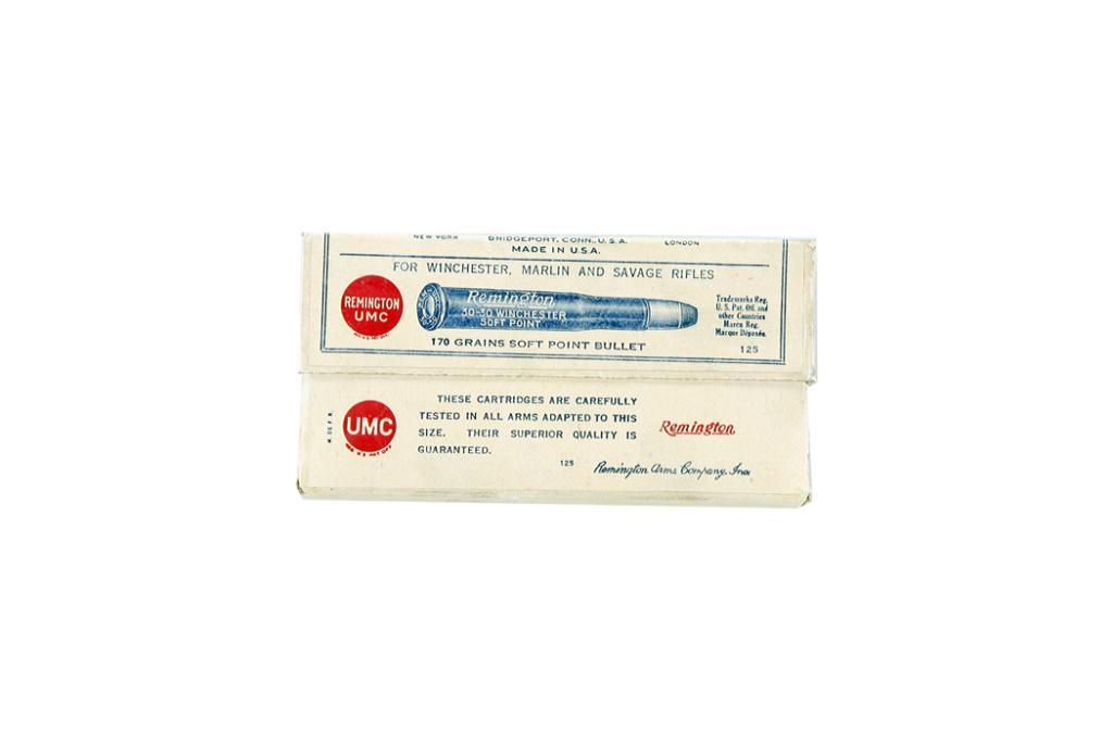 Remington UMC "Smokeless Powder" Ammunition Red circle marked box of twenty center fire unfired 30-30 Winchester, Marlin and Savage soft point lead cartridges, Circa 1930s production Collector Ammunition.Red circle marked box of twenty center fire unfired 30-30 Winchester, Marlin and Savage soft point lead cartridges, Circa 1930s production Collector Ammunition.