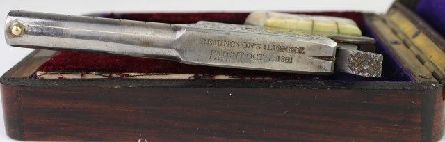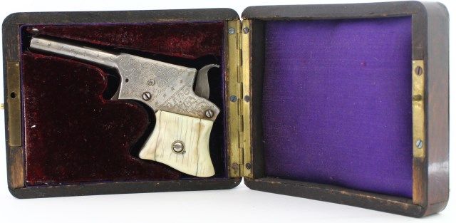 saw handle Derringer, engraved, bone ivory grips, includes period rosewood case. Good functioning action with descent bore. Antique. Est. 850-1500