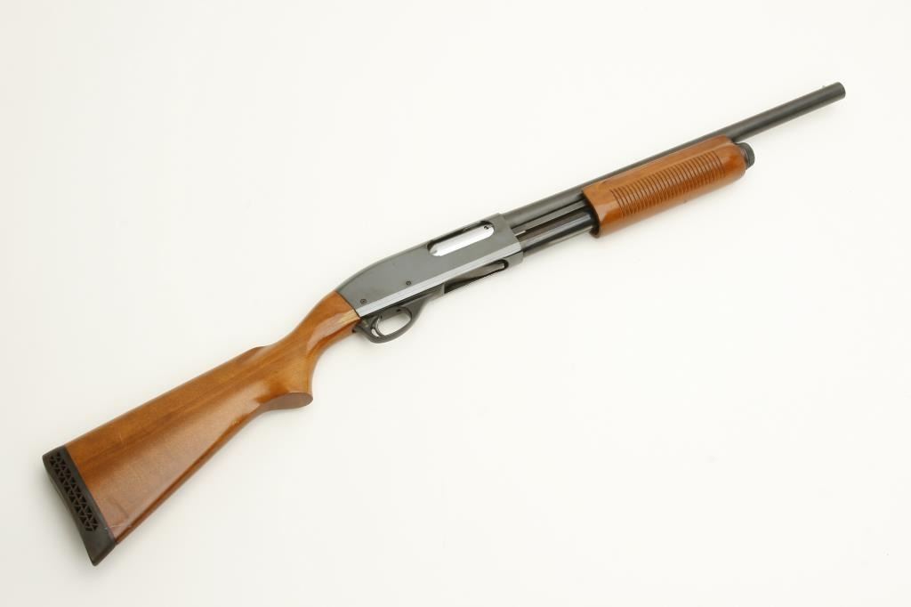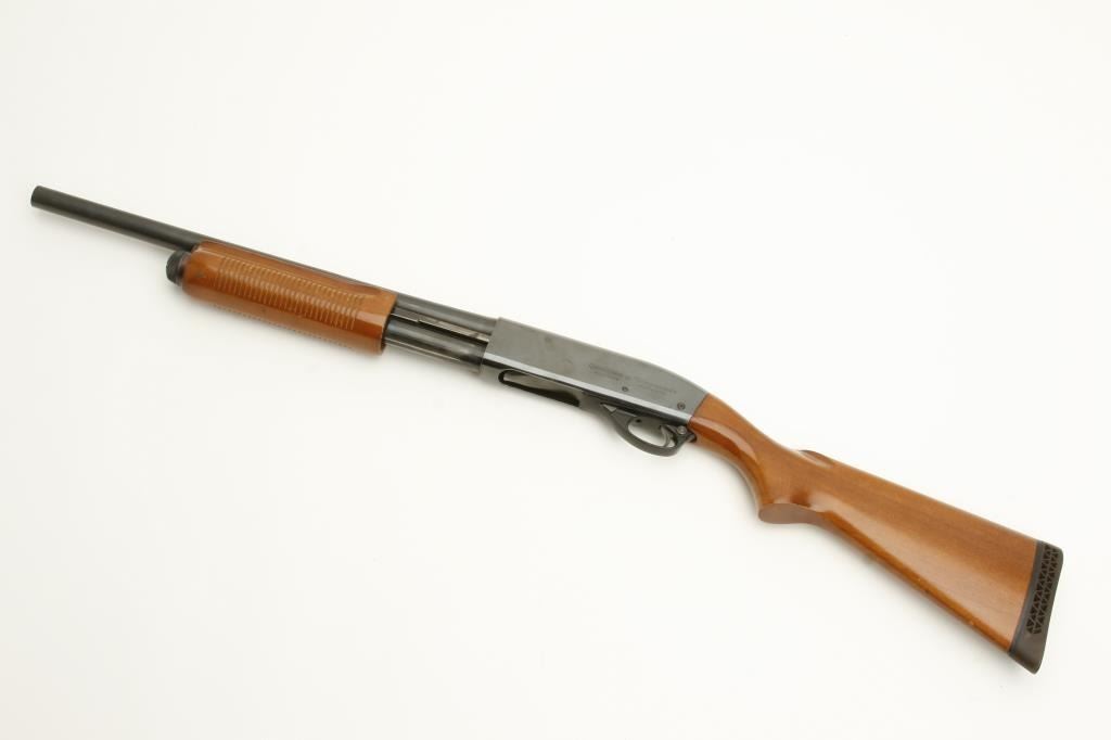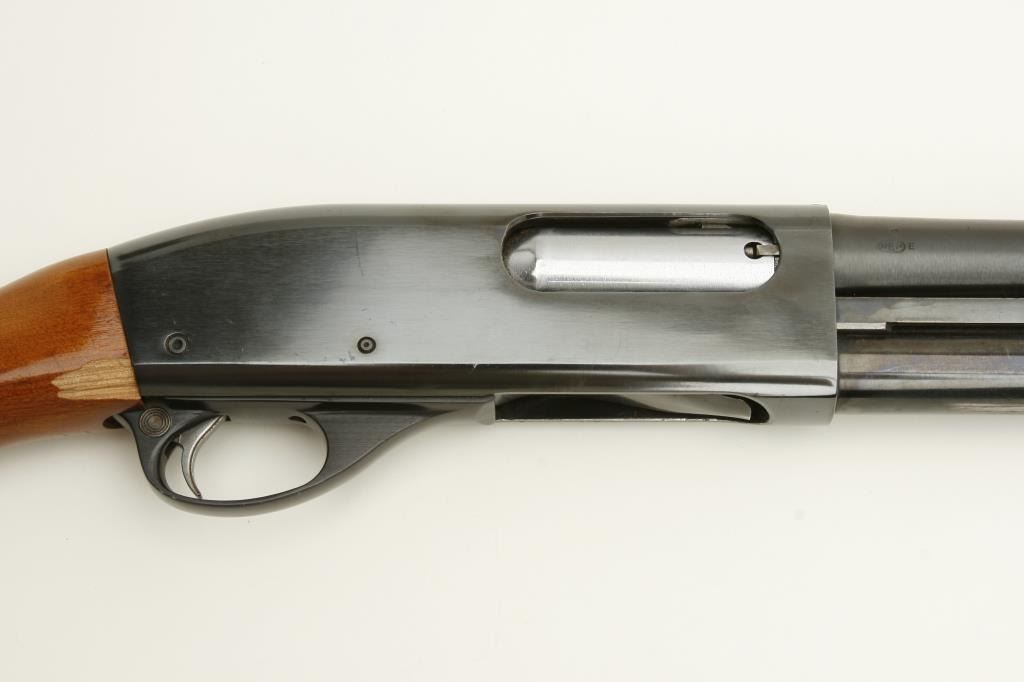 Remington Wingmaster Model 870 pump shotgun, 12 gauge, serial #V629370V. The shotgun is in very good condition with an 18”: barrel with a steel bead front sight. The barrel and receiver retain the majority of theirblued finish with only small mars and handling marks noted. The smooth wood stocks are in very good condition with only handling marks and a ¾” chip at the wrist. The butt stock ends with a ventilated rubberpad and a 14” LOP. The bore is good, the action crisp and markings are sharp. (Modern) Est.: $300-$600.