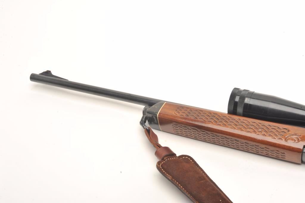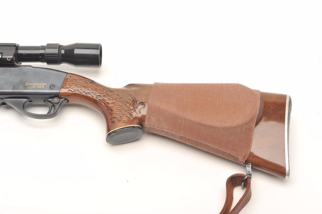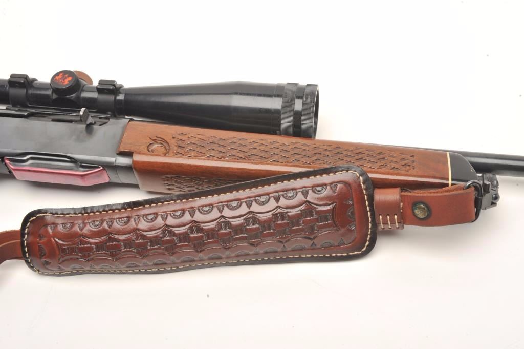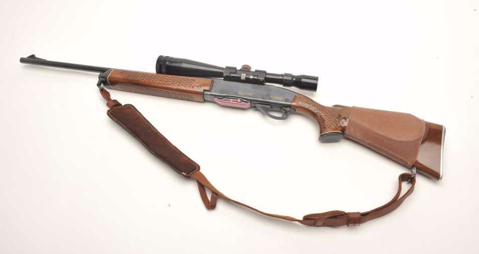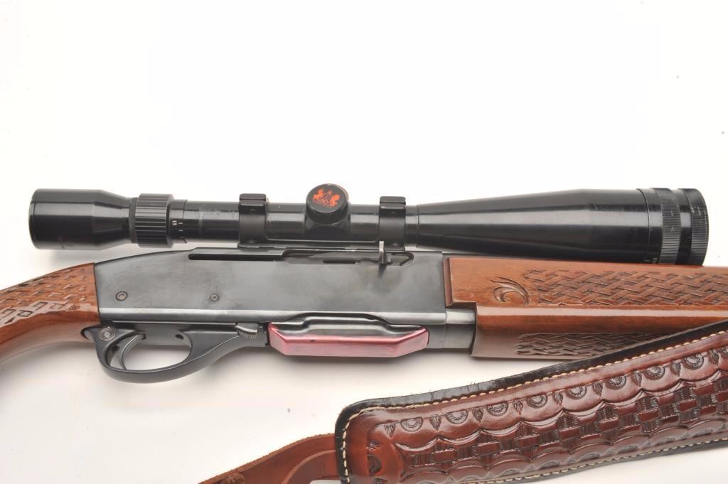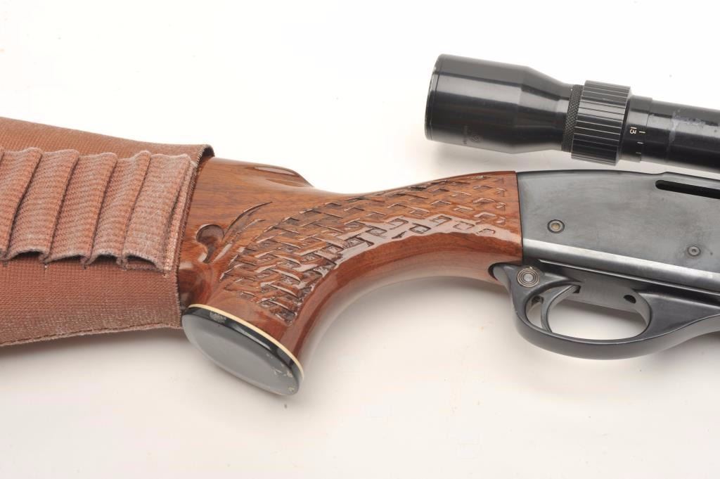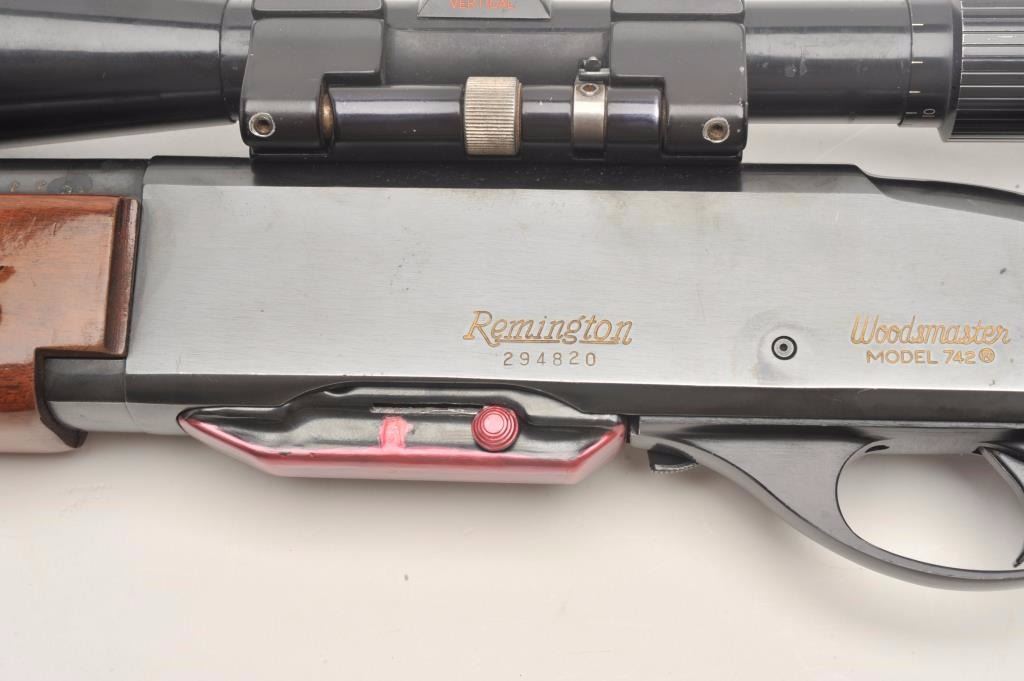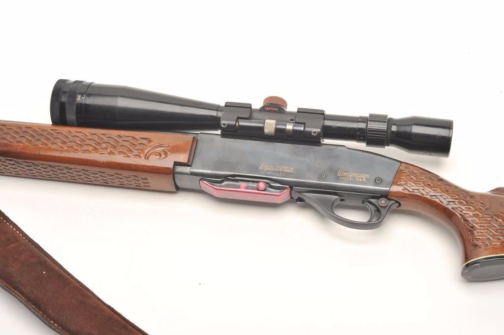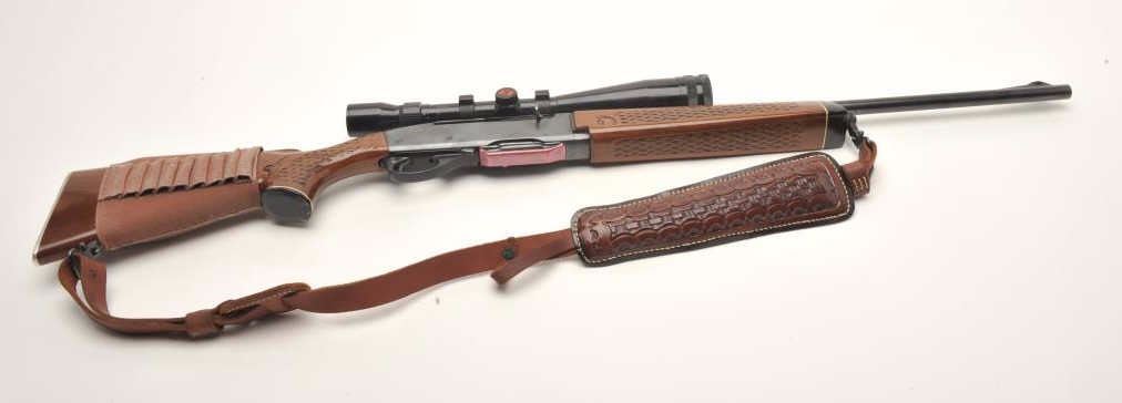 Remington Woodmaster Model 742 semi-automatic rifle, .30-06 SPRG. caliber, 22” barrel, blued finish, wood stock, leather sling and fabric butt stock shell carrier, S/N 294820, in overall very good to near fine condition,mounted with a Herter’s 5-13X40 scope displaying crisp optics, majority of original finish, very good to fine bore, crisp action, sharp markings and very good to fine wood stocks. (Modern/PPT). Est.:$300-$600.