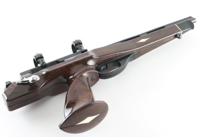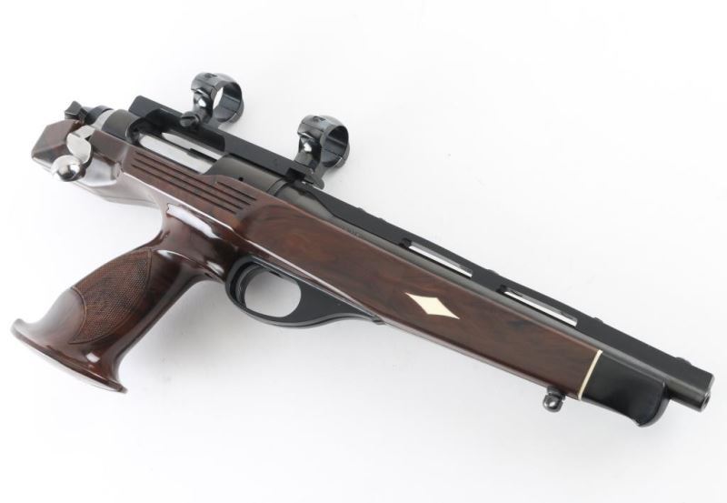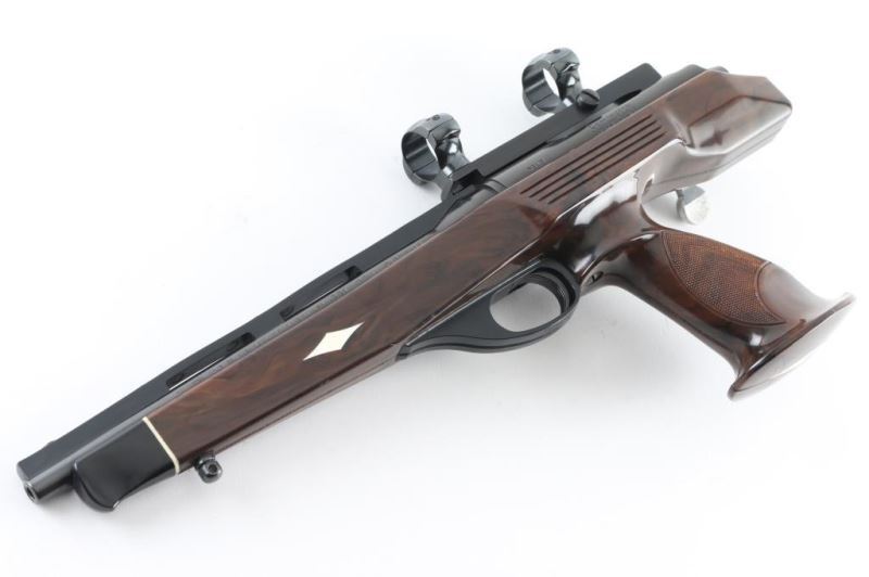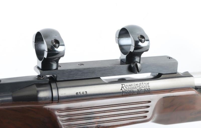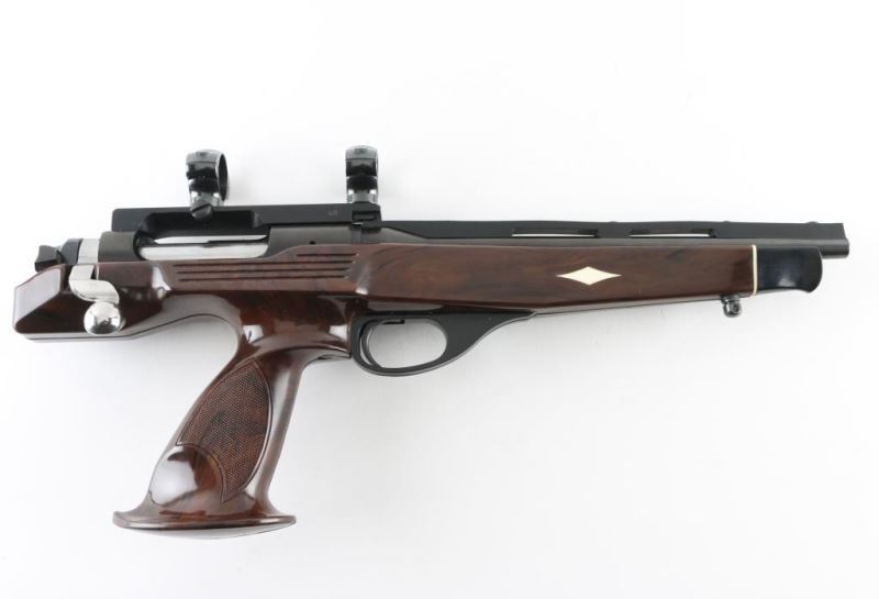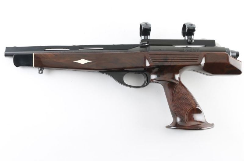 The XP-100 was based on Remington's short action bolt action carbine, the Remington Model 40X. It has a 10.75" barrel set into a nylon stock with an unusual center-mounted grip. This one has no sights on the vent rib but does have a scope base and rings mounted. The gun looks great with little to no sign of handling and the bore is bright. Condition is NRA Very Good+