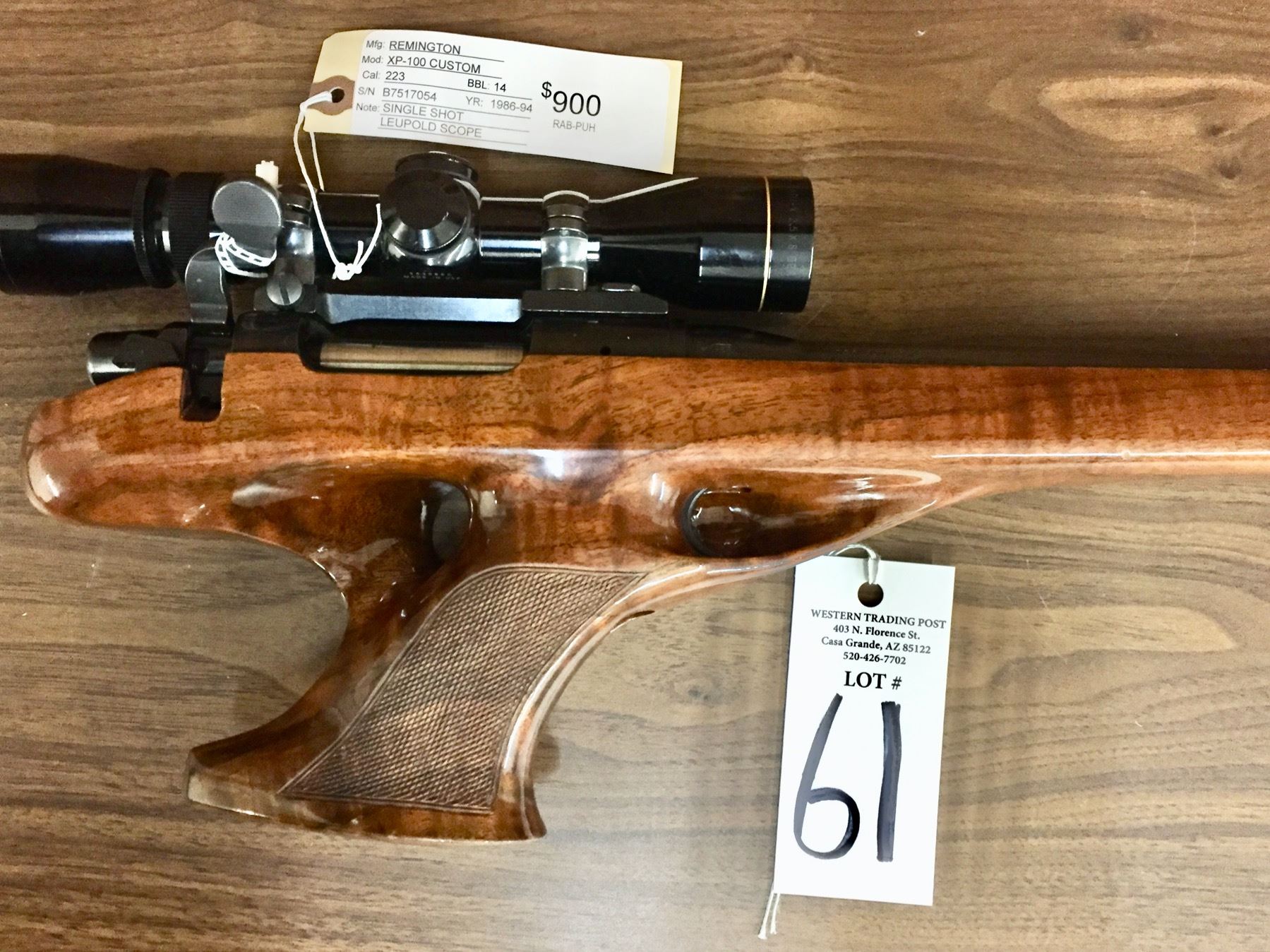 Description: For sale in this lot is a custom Remington XP-100 in .223 caliber with Leupold scope. It is in like new condition. Maker: Remington. Approx. Age: 1986 - 1994. Serial No. B7517054. Size: 14” Barrel. Condition: Very good to excellent for its age, minor wear expected. Please look closely at the pictures - they are an important part of our description. Shipping: There will be a $15 handling, packaging fee for shipping this lot. The actual cost of postage will be added on top of that. *****This firearm requires an FFL Transfer*****