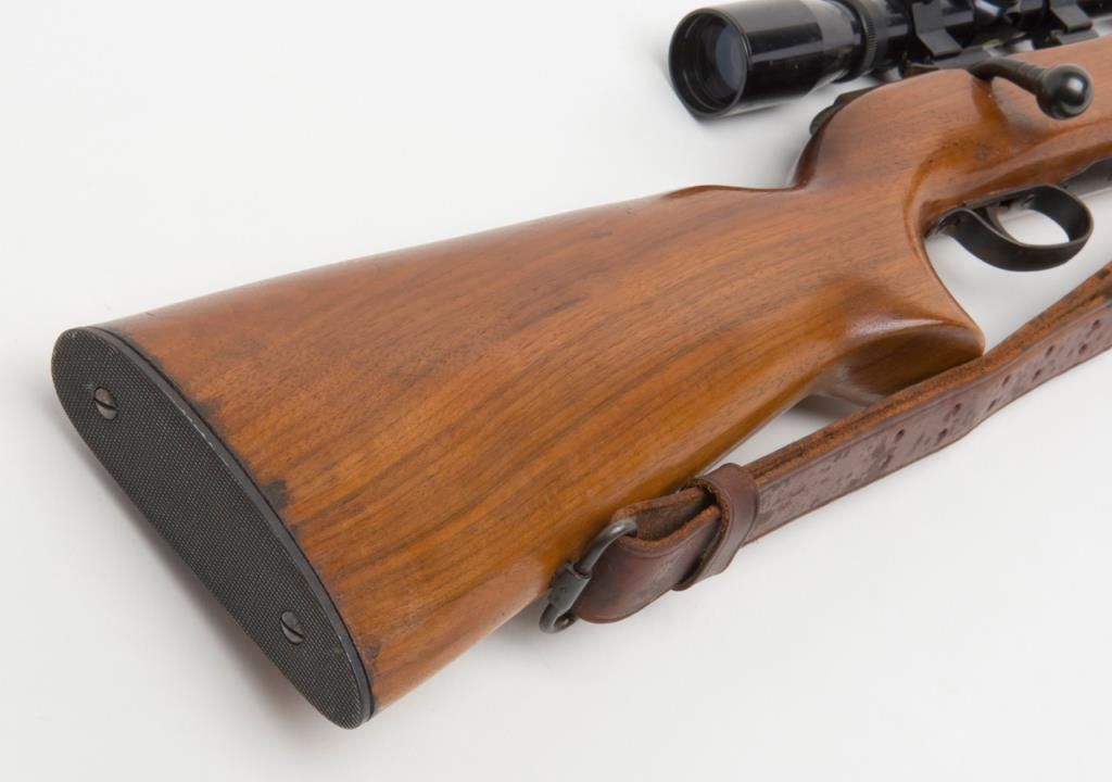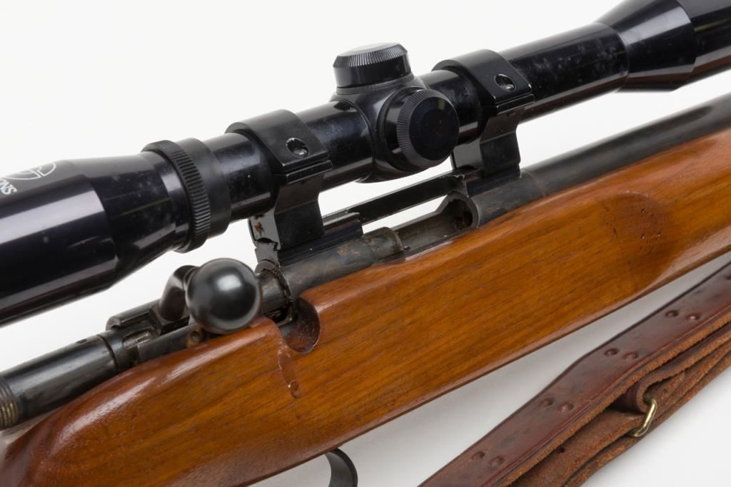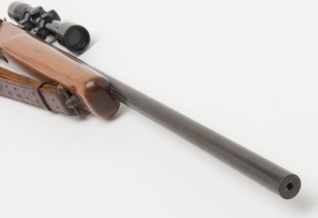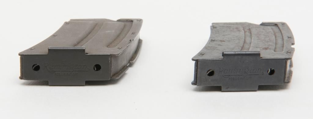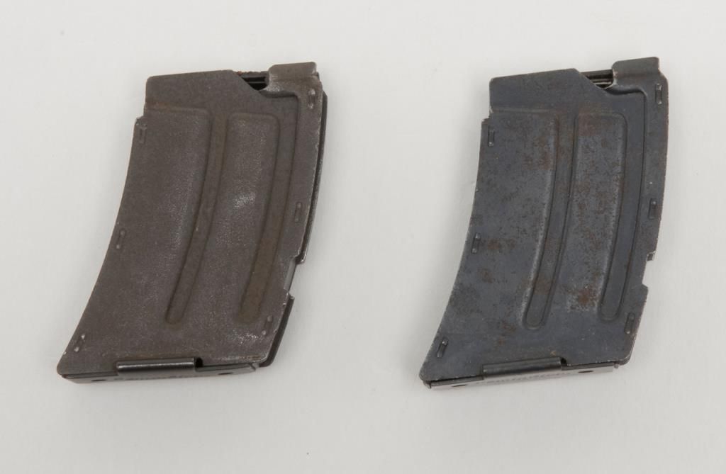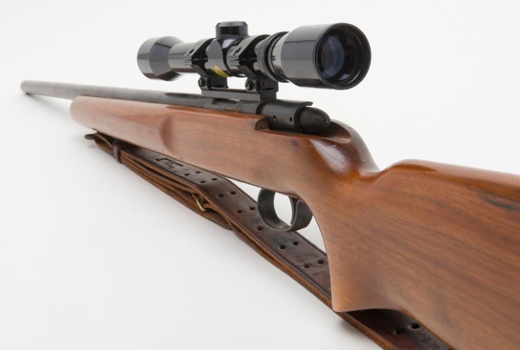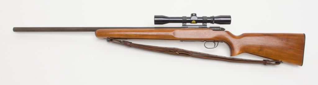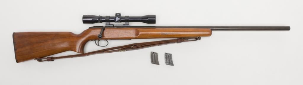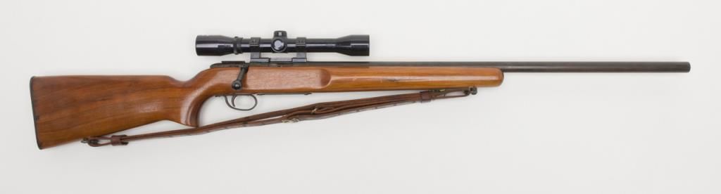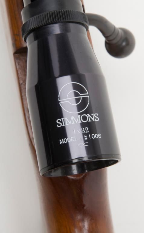 Remington bolt action rifle, cal. .22, Serial #NSNV. The rifle is in overall good condition with a 26” blued barrel with front and rear sights removed. The barrel retains 40% of its blued finish with the remainder becoming patina, whilethe action has some light surface rust. The smooth wood target style stock is in overall good condition as re-finished, with a checkered metal butt plate. The rifle is topped by a Simmons 4x32 fixed power scope, one piece mount and comes with a military style leather sling. The bore is good and action working on this Remington. The lot includes two Remington marked magazines. (C+R/PPT). Est.: $200-$400.
