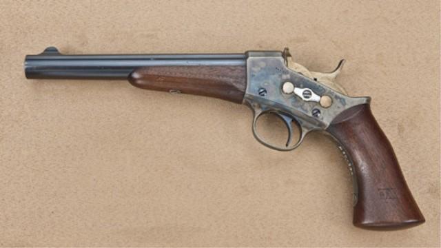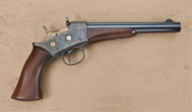 Remington model 1871 Army model .50 caliber centerfire, US martial issue Rolling Block pistol in fine to near mint original condition, blue and case hardened finish, cartouche wood stocks, serial #2652. The barrel shows approx. 96-98% original blue, some slight wear at the muzzle, a couple of minor storage type miniscule marks. The frame shows 96-98% plus original bright case hardening that is still very colorful and just aging slightly. The cartouche wood stocks are fine to excellent with razor sharp C.R.S. marks with one small chip to inner edge. The inside of strap is marked in painted letters “30-340” “1970” which indicate Don Ware inventory numbers, which are easily removable. Small parts show bright origina straw and blue finished. The bore excellent to near mint. 9.8 plus on a 1-10 scale. Provenance: Don Ware, Jerry Landskron collection. Est: $3,500 - $7,000
