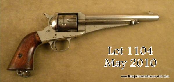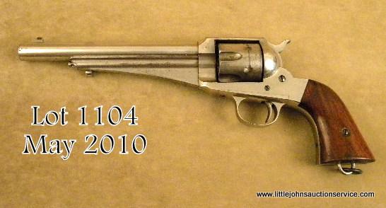 Remington model 1875 Single Action revolver, 7-1/2" barrel, nickel finish, .44-40 caliber, varnish wood grips, in very good plus to near fine original condition, serial #568. The revolver shows 80-90% original nickel, most of loss offinish on the cylinder and edges. Areas where finish is lost shows some erosion and pinprick pitting just starting. The front sight has been neatly reshaped with copper insert, which is professionally done. The varnish wood grips arevery good plus with 75-85% varnish. The markings are sharp, the edges are crisp, the action tight. The bore is fair to good with some dark areas that may clean. The pistol has been period fitted with a lanyard and loop and there are large stampinin the initials "L P" on the butt. A very good looking Remington which is all original with no polishing. Inside of grips marked 'Dawson, Y.T, D.W. Parcher' who is said to have been prospecting in the Yukon when he had this gun. Fine example.Est: $3,000 - $6,000