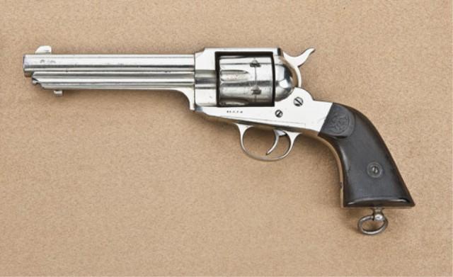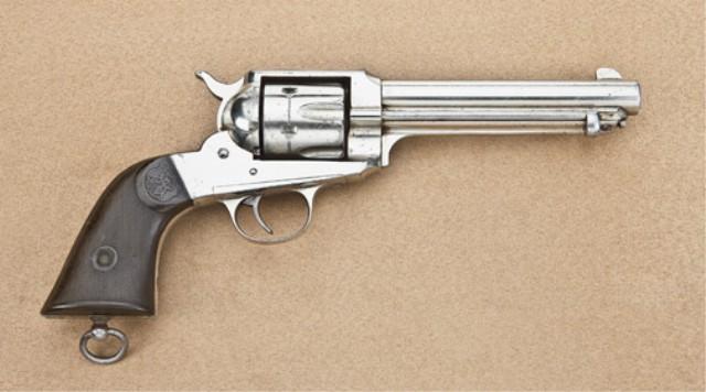 Remington model 1890 single-action revolver, .44-40 caliber, factory 503/4” barrel, nickel plated, hard-rubber grips, lanyard in butt, serial #783. The revolver shows 90-95% original nickel, some slight losses at muzzle and high points, some minor scratches, slight erosion and pinprick pitting where the nickel has lifted, some light cleaning but no polishing. The front sight has been slimmed slightly. The cylinder pin, ejector rod, and small parts are all original. The grips are good with even wear, three small notches at reverse from possible gunfight or number of ex-wives which would be worse. The action is good, the bore is very good. Est: $4,500 - $9,000