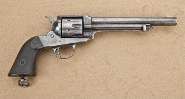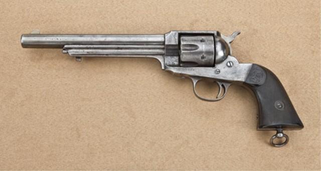 Remington model 1890 single-action revolver, 7-1/2” barrel, .44-40 caliber, blue finish, hard-rubber grips, serial #1557. The revolver remains in good original condition showing 10-20% original blue drifting to brownish grey patina, some light to moderate erosion and pinprick pitting. The barrel address is good and crisp, the barrel address has been slimmed slightly. There are some marks, dings, scratches, and some slightly heavier pitting on the back of frame in front of cylinder from firing. The caliber marking on the left side of the frame is good. There are initials lightly scratched between the hammer screw and appear to read “DAM”. The grips are good with some high point edge wear. The hammer shows traces of case hardening, the action is good, the bore is very good and still bright. Est: $5,000 - $7,000