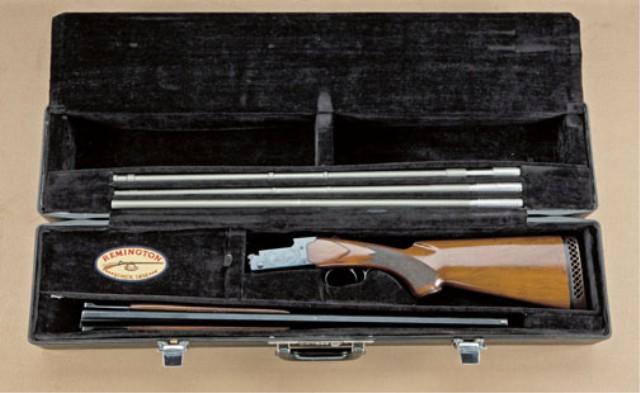Remington model 3200 12ga over/under shotgun, single trigger, auto ejector, factory 26” split barrels, ventilated rib, choked Skeet over Improved Cylinder. Serial #OU20528. The gun remains in very good used condition showing 85-85% evenly toning blue finish with some slight plumbing. The stock measures 13-1/4” to the end of the wood, 14-1/2” to the end of the extended Remington hard-rubber recoil pad. A set of Purbaugh type tubes are included in 20ga, choked Skeet and Skeet and 410ga choked Improved Cylinder and Improved Cylinder. And 28ga tubes choked Skeet and Skeet. With tool and extractors. In carrying case. Est: $1,250 - $2,500