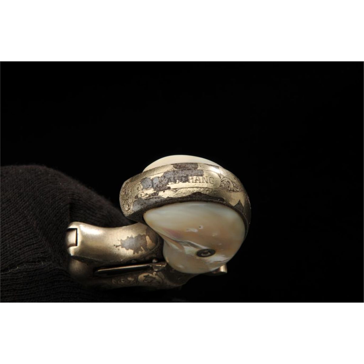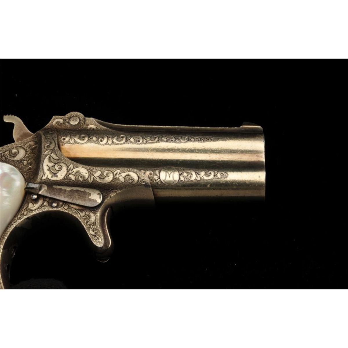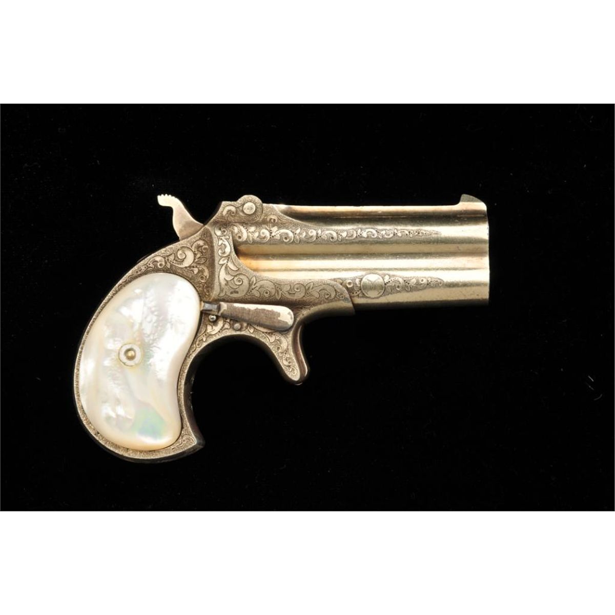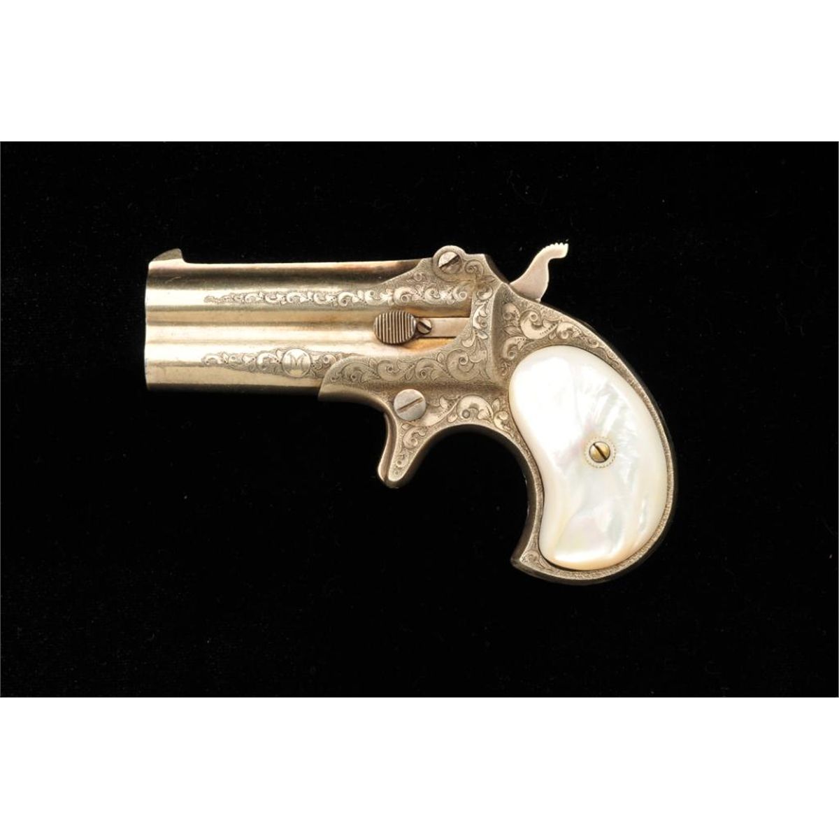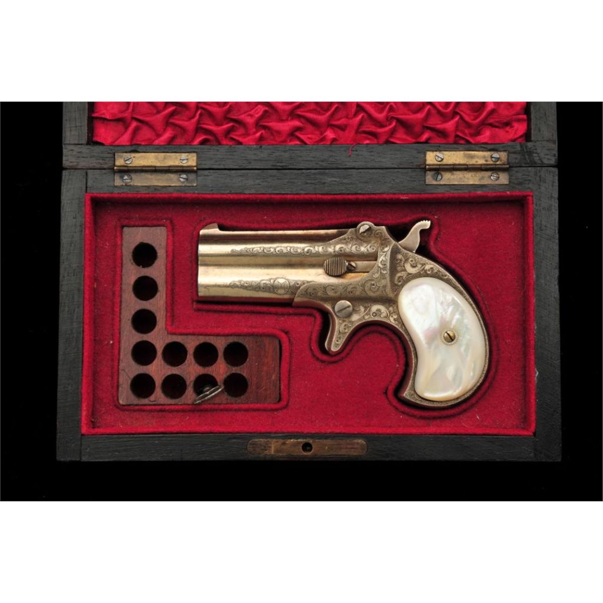 Remington over/under derringer, last variation, with monoblock barrels, made without rib. Remington UMC address. Finely period deluxe engraved, pearl grips, inscribed “MM” on barrels and butt inscribedAJ Pashang, who was a priest of the Catholic foreign mission society and served in China. Serial #L75481. In its original to the period felt and fancy crushed satin-lined rosewood case. Illustrated in color, page 95, TheRemington Double Derringer by Drummond, Johnson, Etc. The derringer retains 90-95% original silver plate with light gold wash, some slight peeling at the edges of the butt and backstrap but completely uncleaned withexcellent pearl grips. Interior shows no firing or use. The patina is completely uncleaned, plating unpolished. The interior of the case is very good plus to near fine, just slightly dusty. The original key isretained, exterior very good. Possibly the finest engraved monoblock derringer known to collectors and bearing some interesting history. Est: $7,000 - $14,000