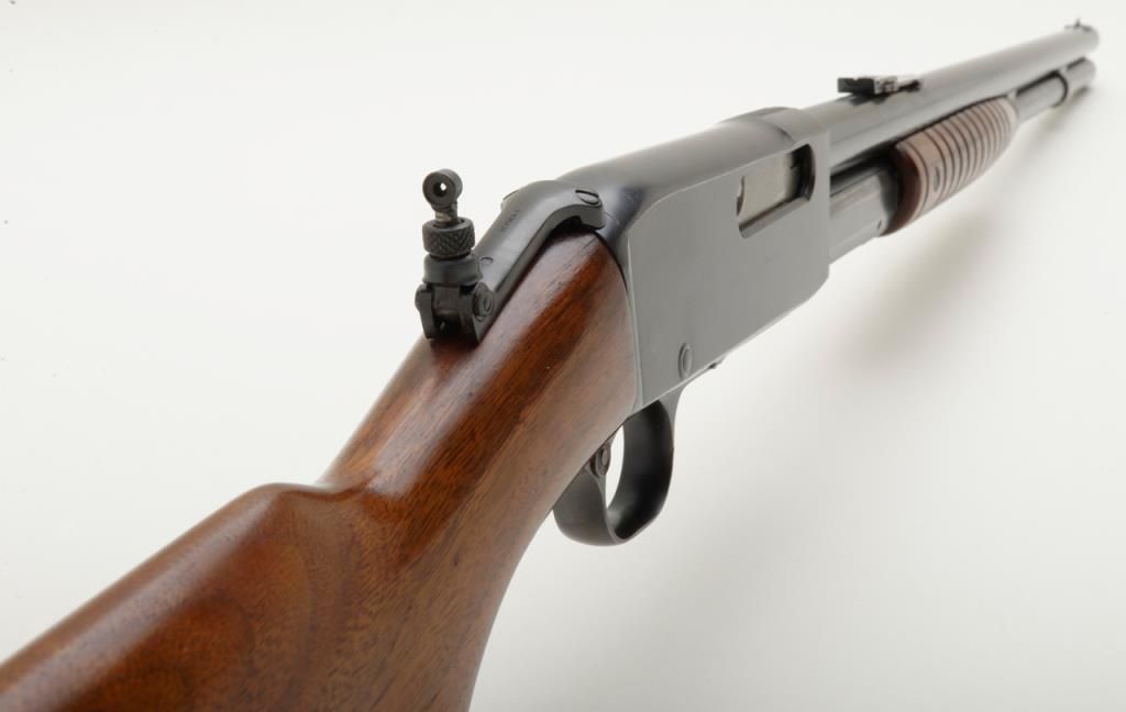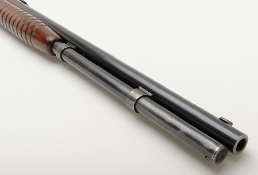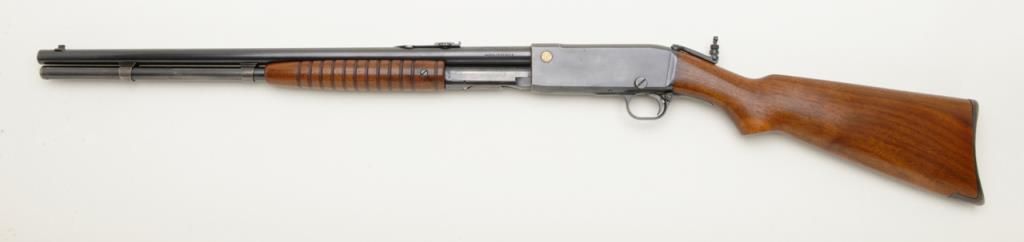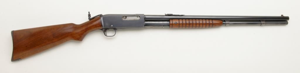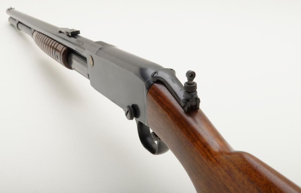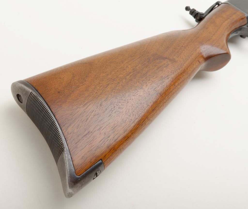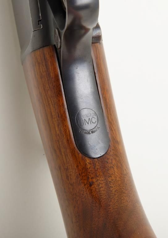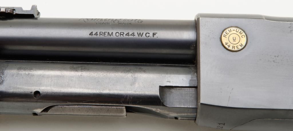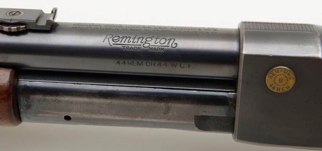 Remington pump action rifle in .44-40 caliber remaining in very good plus to near fine original condition showing Lyman tang sight, serial number 66921. The rifle retains 85% to 95% original blue thinning at the edges and operating areas with just some minor normal aging. The stocks are also very good plus to near fine showing light handling and minor use. The edges are sharp and the action is crisp. The bore is bright. Desirable and hard-to-find. Est.: $900-$1800