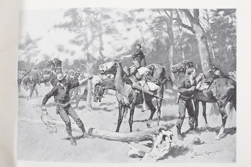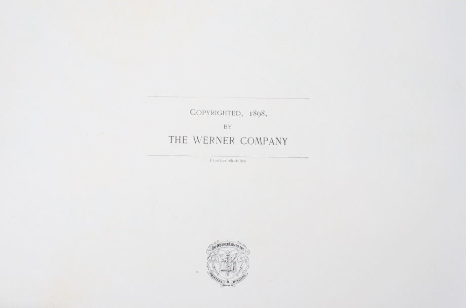 This is a RARE edition of "Remington's Frontier Sketches" by Frederic Remington and published in 1898 by the Werner Company. Remington is arguably one of the most influential Western artists who ever lived. This book was published at about the pinnacle of his career and highlights some of his best works thus far. The book is in good condition overall for its age with some damage along the spine. The book measures 12 1/2" long by 9 1/2" tall.