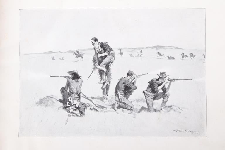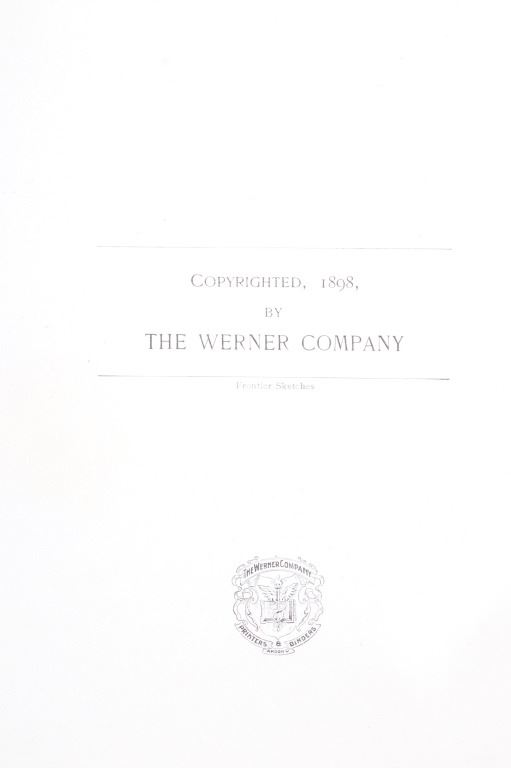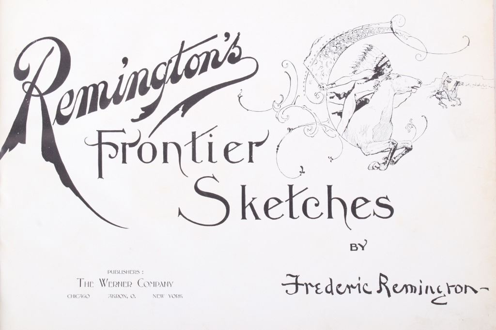 For your consideration is this RARE edition of "Remington's Frontier Sketches" by Frederic Remington and published in 1898 by the Werner Company. Remington is arguably one of the most influential Western artists who ever lived. This book was published at about the pinnacle of his career and highlights some of his best works thus far. The book is in good condition overall for its age with some damage along the spine. The measurements of this book are 12 1/2" long by 9 1/2" tall.