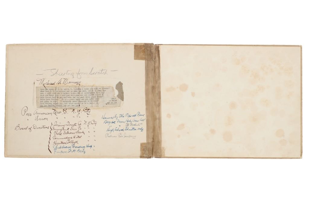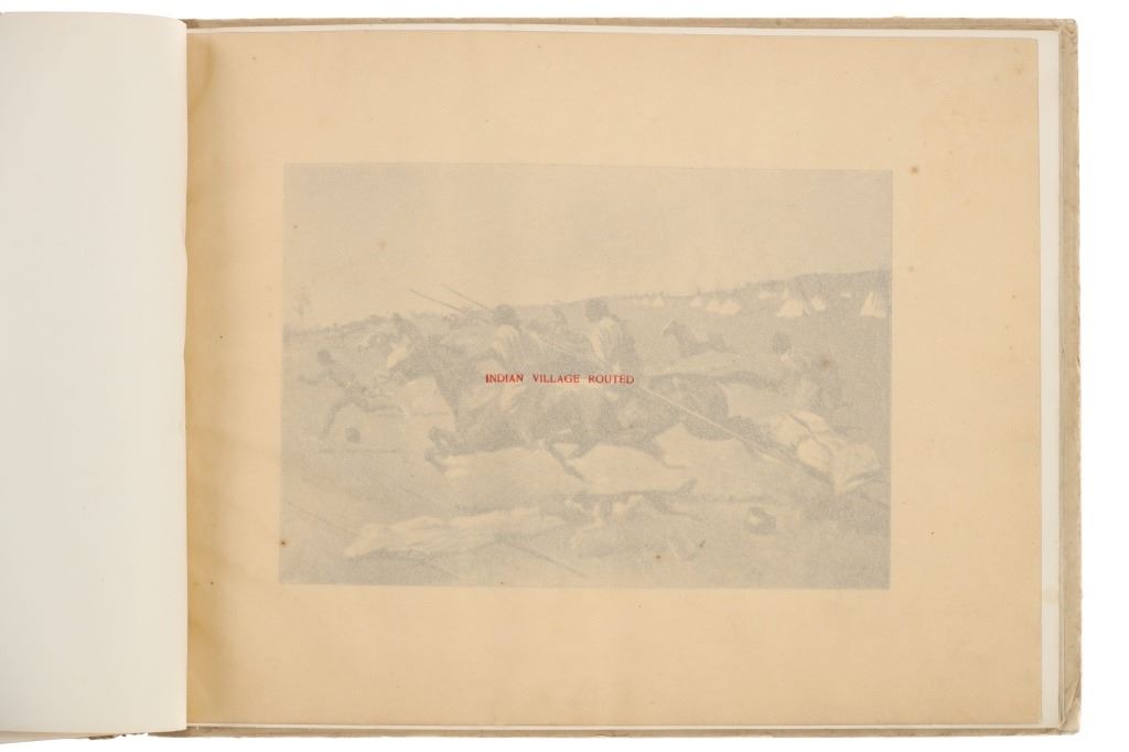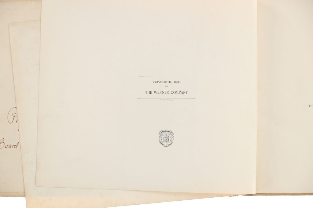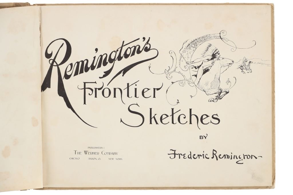 For your consideration is a RARE First Edition of "Remington's Frontier Sketches" by Frederic Remington and published in 1898 by the Werner Company. This was the personal copy of Michael A. Morrissey, former Chairman of both the American News Company and Union News Company, was made a Knight of Malta by Pope Pius XII and was on the Board of Directors for Chase National Bank, the Empire State building and Hunter College, all of New York. Remington is arguably one of the most influential Western artists who ever lived. This book was published at about the pinnacle of his career and highlights some of his best works thus far. Frederic Sackrider Remington was an American painter, illustrator, sculptor, and writer who specialized in the genre of Western American Art. His works are known for depicting the Western United States in the last quarter of the 19th century and featuring such images as cowboys, Native American Indians, and the US Cavalry. Unpaginated and illustrated with title page vignette, 15 monochrome full page plates with captioned tissue guards printed in red. The noted collection of Remington's distinctive drawing of the American West depicting battle scenes between the U.S. Calvary and Plains Indians. White cloth bound hardcover illustrated book with some scuffing, soiling noted on the cover, repair to spine/covers hinge. Gold gilt top, bottom, and fore edges of intact pages, age tanning and foxxing observed throughout, moisture damage exhibited. Measures 9.5"W x 12"L x .5"D, weight 1lb, 12oz.