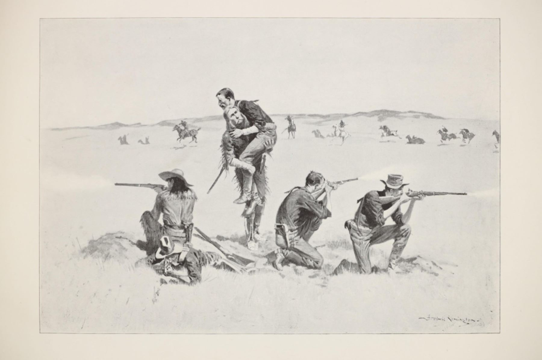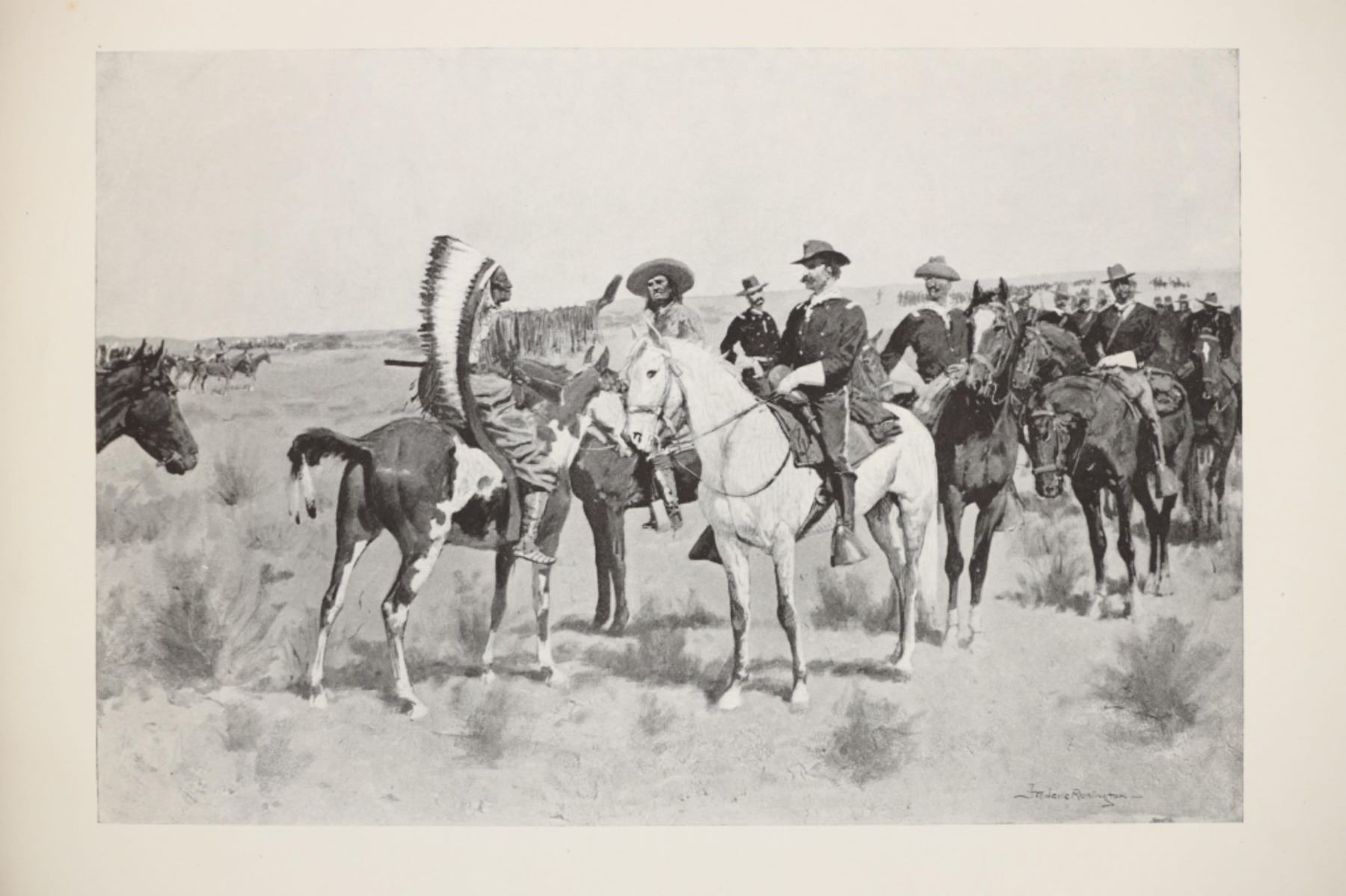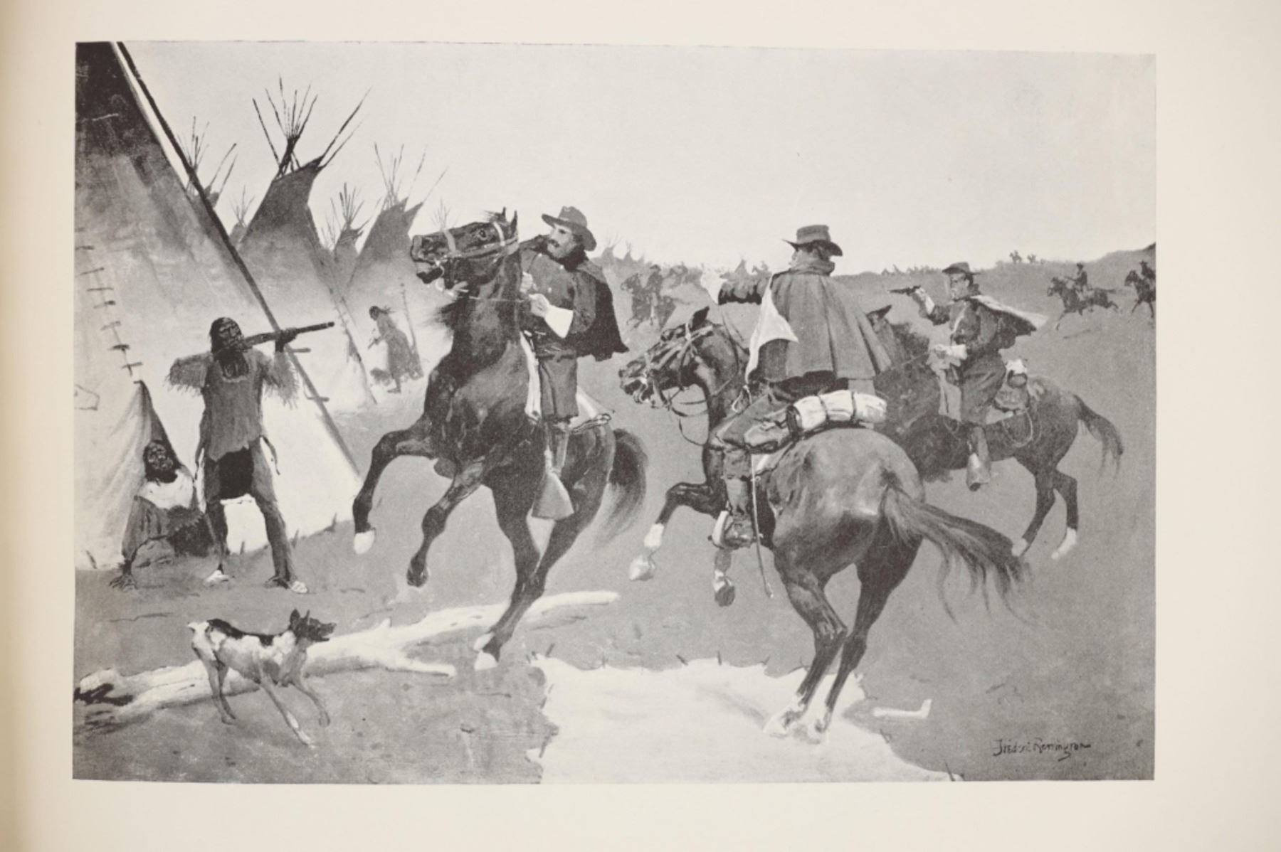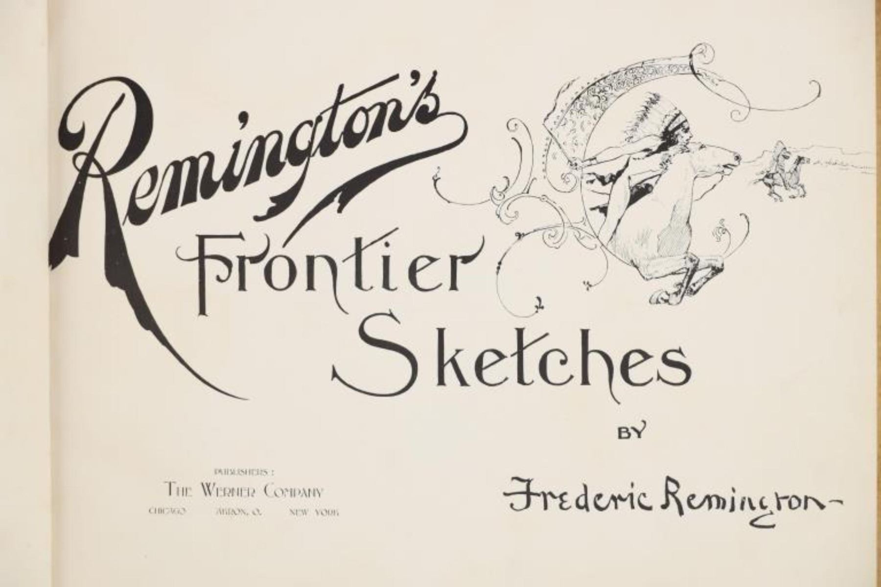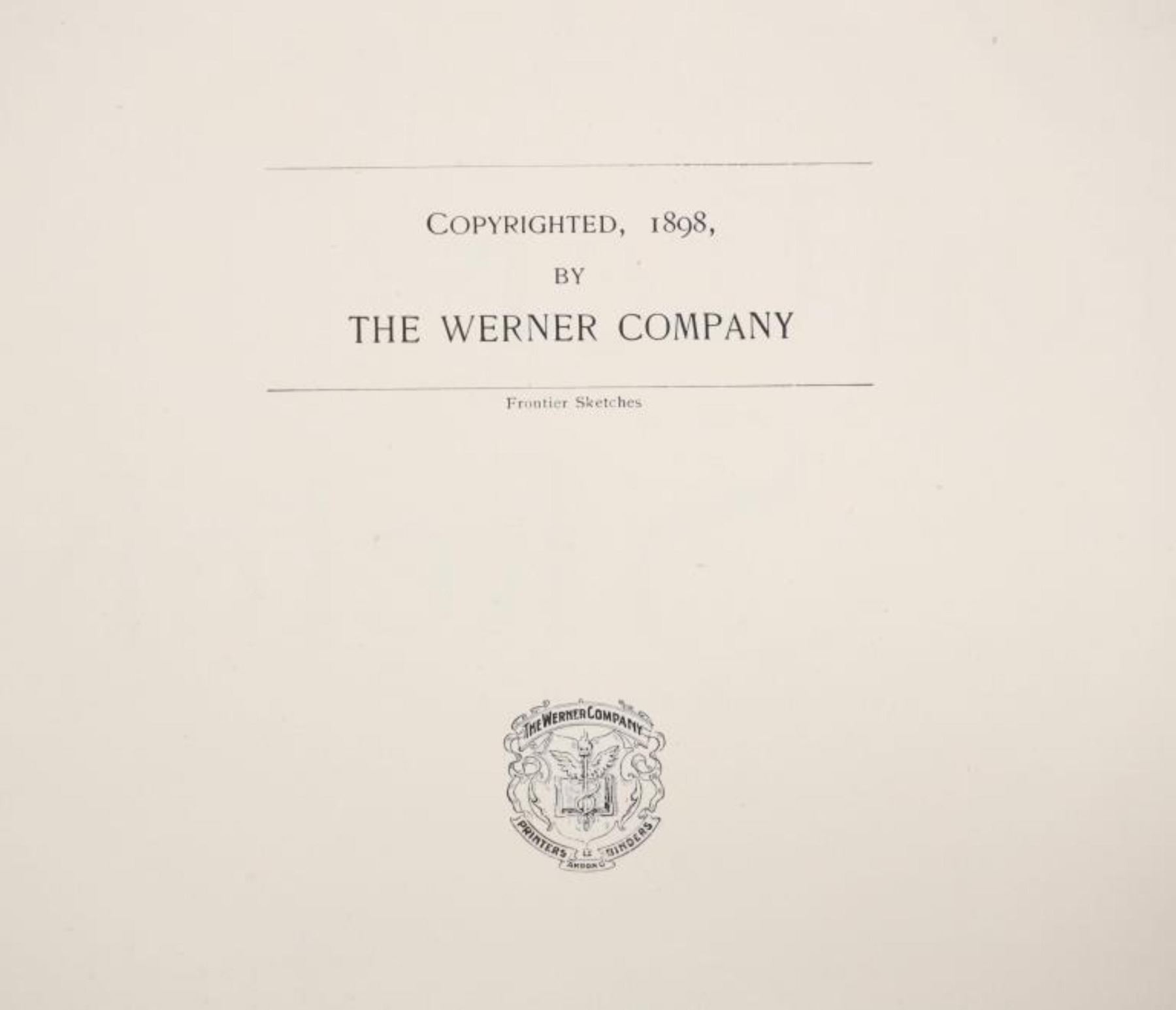 This is a RARE First Edition of "Remington's Frontier Sketches" by Frederic Remington and published in 1898 by the Werner Company. Remington is arguably one of the most influential Western artists who ever lived. This book was published at about the pinnacle of his career and highlights some of his best works thus far. Frederic Sackrider Remington was an American painter, illustrator, sculptor, and writer who specialized in the genre of Western American Art. His works are known for depicting the Western United States in the last quarter of the 19th century and featuring such images as cowboys, Native American Indians, and the US Cavalry. Unpaginated and illustrated with title page vignette, 15 monochrome full page plates with captioned parchment tissue guards printed in red. The noted collection of Remington's distinctive drawing of the American West depicting battle scenes between the U.S. Calvary and Plains Indians. White cloth bound illustrated hardcover with some scuffing, soiling noted on the cover, splitting exhibited on hinges. Gold gilt intact page top, bottom and fore edges. Age tanning and foxing exhibited on tissue guards. A collectable copy of an uncommon work. Measures 9.5"W x 12"L.