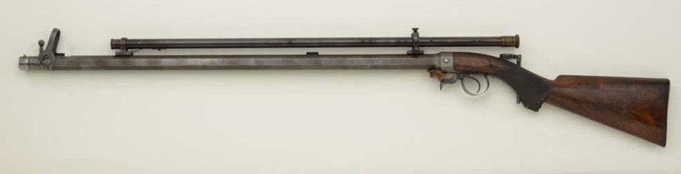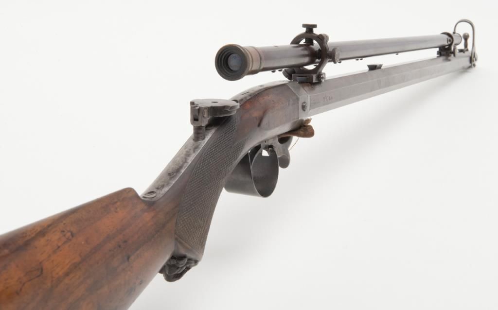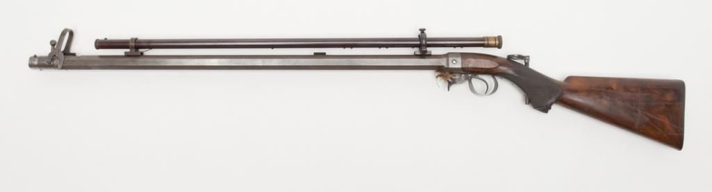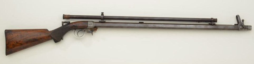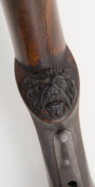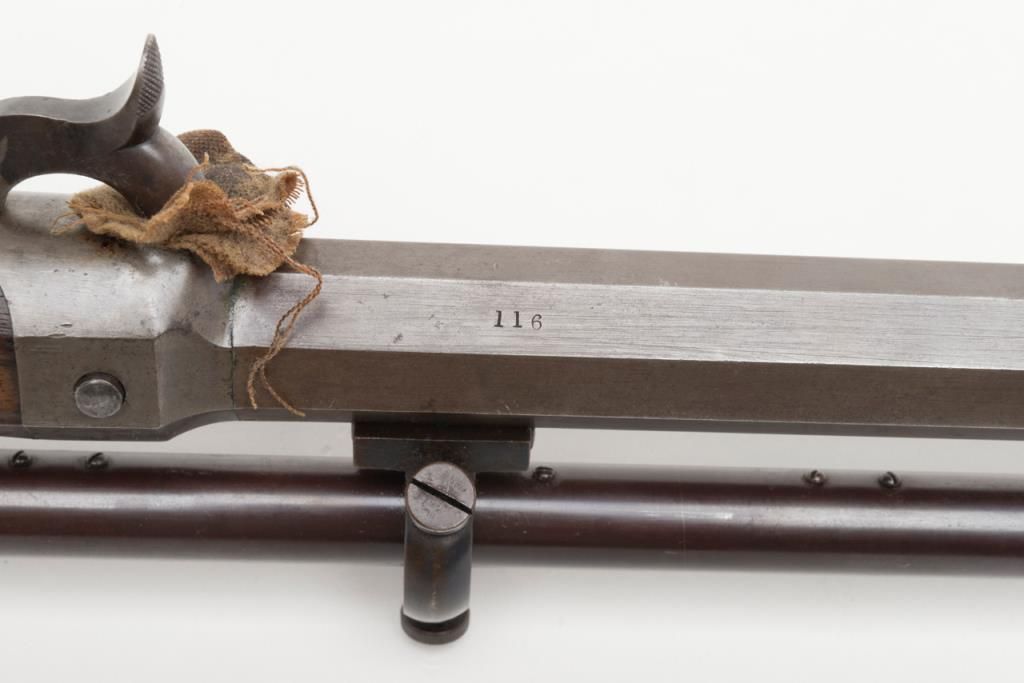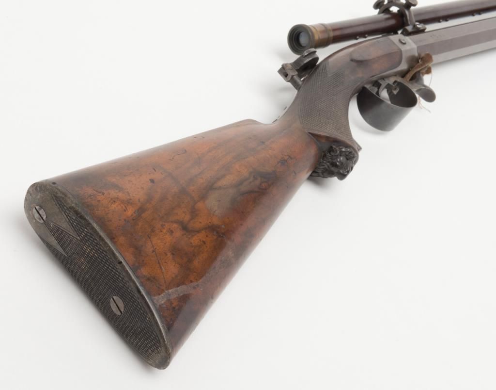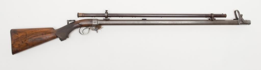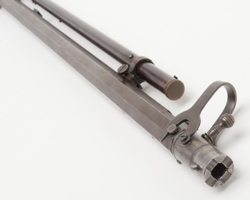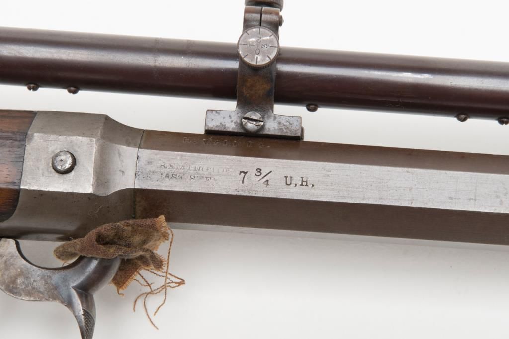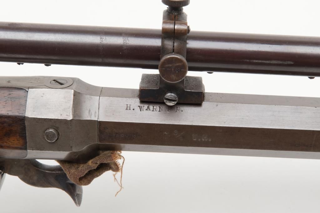 Remington underhammer target single shot rifle with barrel stamped “H. Warner” and “7-3/4 U.H.” at breech, .41 cal., 28” heavy octagon barrel with detachable bullet starter, checkered wood butt stock with carved figure of a lion’s head affixedto the end of the semi-pistol grip, checkered hard rubber butt plate, #NVSN; mounted with a period tube telescope sight. This interesting target gun is in overall very good condition showing a light brown patina on metal surfaces, good action, goodbore, folding rear sight, overall good wood stock with checkered horn butt plate. (Antique). Est.: $2,400-$3,800
