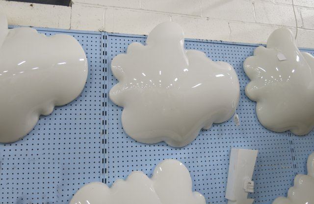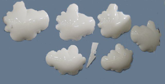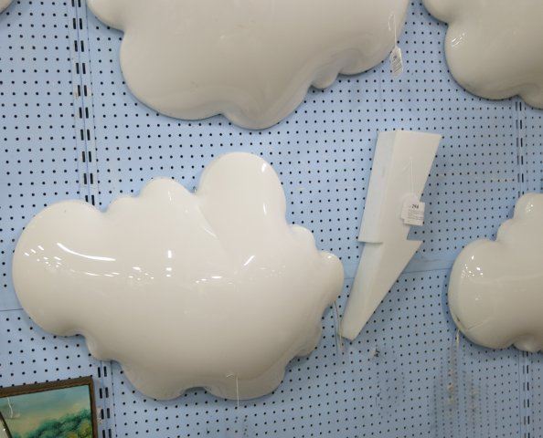 Ca. 1985. Each signed & labeled & including a lightening bolt. 7 pieces. Approx. 28" H x 33" W. 1 cloud chipped, 2 missing lamps, 1 missing lighting frame, lightening bolt chipped