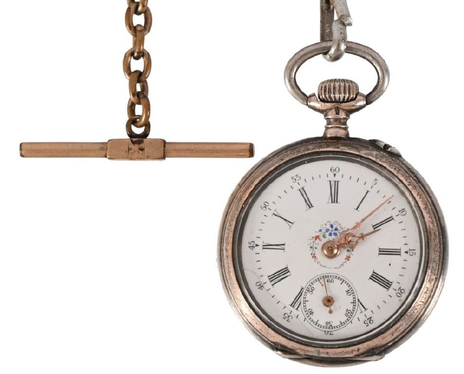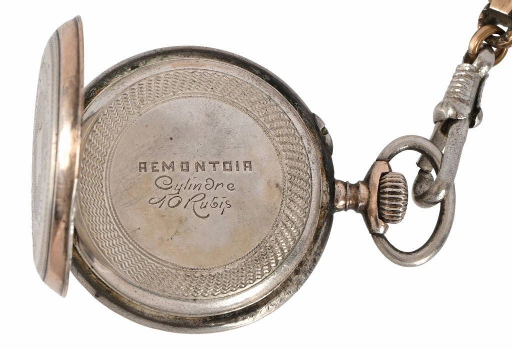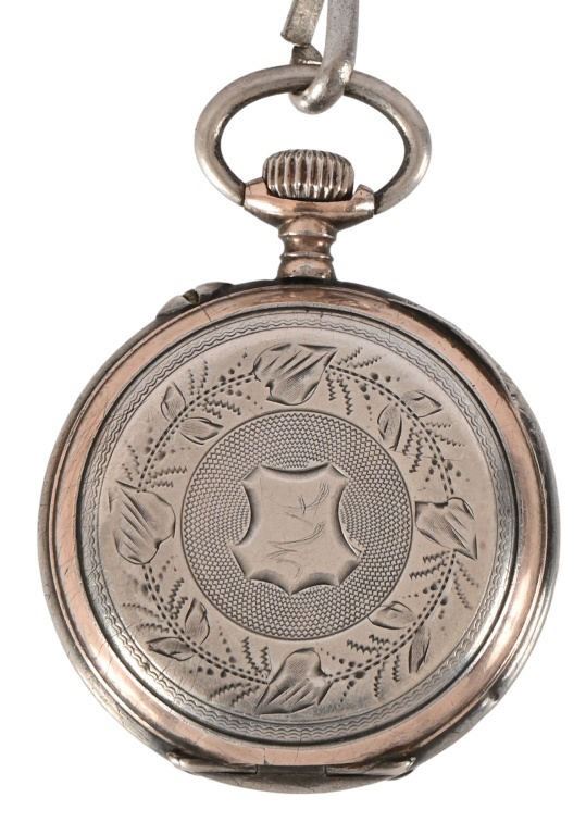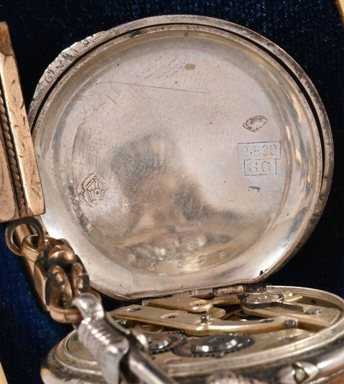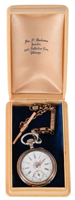 Remontoir Cylindre 10 Rubis Pocket Watch. Case marked 800 continental silver. Comes with vintage case from Geo. P. Anderson Jeweler, 3225 Fullerton Ave, Chicago.