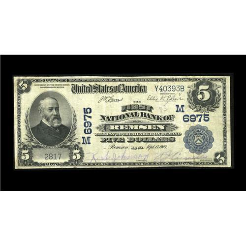 <B>Remsen, IA</B></I> - $5 1902 Plain Back Fr. 598 <B>The First NB</B></I> Ch. # (M)6975<BR>A very tough large note from the only bank in town, with the Kelly census showing just six such examples. Nice <B>Fine+++.</B></I>