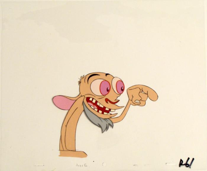 To create production cels, the original animator's drawing is transferred onto an acetate cel (by hand-inking and/or photo copying). The cel is then hand-painted on the reverse side. The cel is ready to be matted and framed. The animator's notations are shown at the bottom of the cel. There is some slight paint fade to Ren's outline.