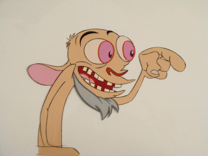 This is an original production animation cel from the Nickelodeon TV show Ren & Stimpy. The show follows two characters - Ren, a crazy Chihuahua - and - Stimpy, an incredibly stupid cat - as they think up to all kinds of hair brained schemes and get themselves into some sticky situations. The Ren and Stimpy Show debuted in August 1991 with a two-part episode, 'Stimpy's Big Day / The Big Shot' and became an instant hit. It was the third Nicktoon ever to be aired on the Network alongside Doug and Rugrats. Ren appears to be paranoidOriginal Production Art Cel Overall Size of the Cel: 10 1/2" x 12 1/2" Very Good condition This is an original hand-painted cel set-up used in the production of an episode of "The Ren & Stimpy Show." Each one-of-a-kind set-up represents a slight change in position of the characters. When individually photographed and projected in rapid succession, the images appear to move.