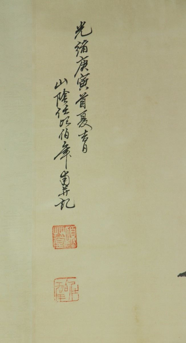 Scholar figures; Chinese ink and watercolour on paper; hanging scroll; signed Ren Bonian and inscribed with two artist seals; 158 cm × 54 cm