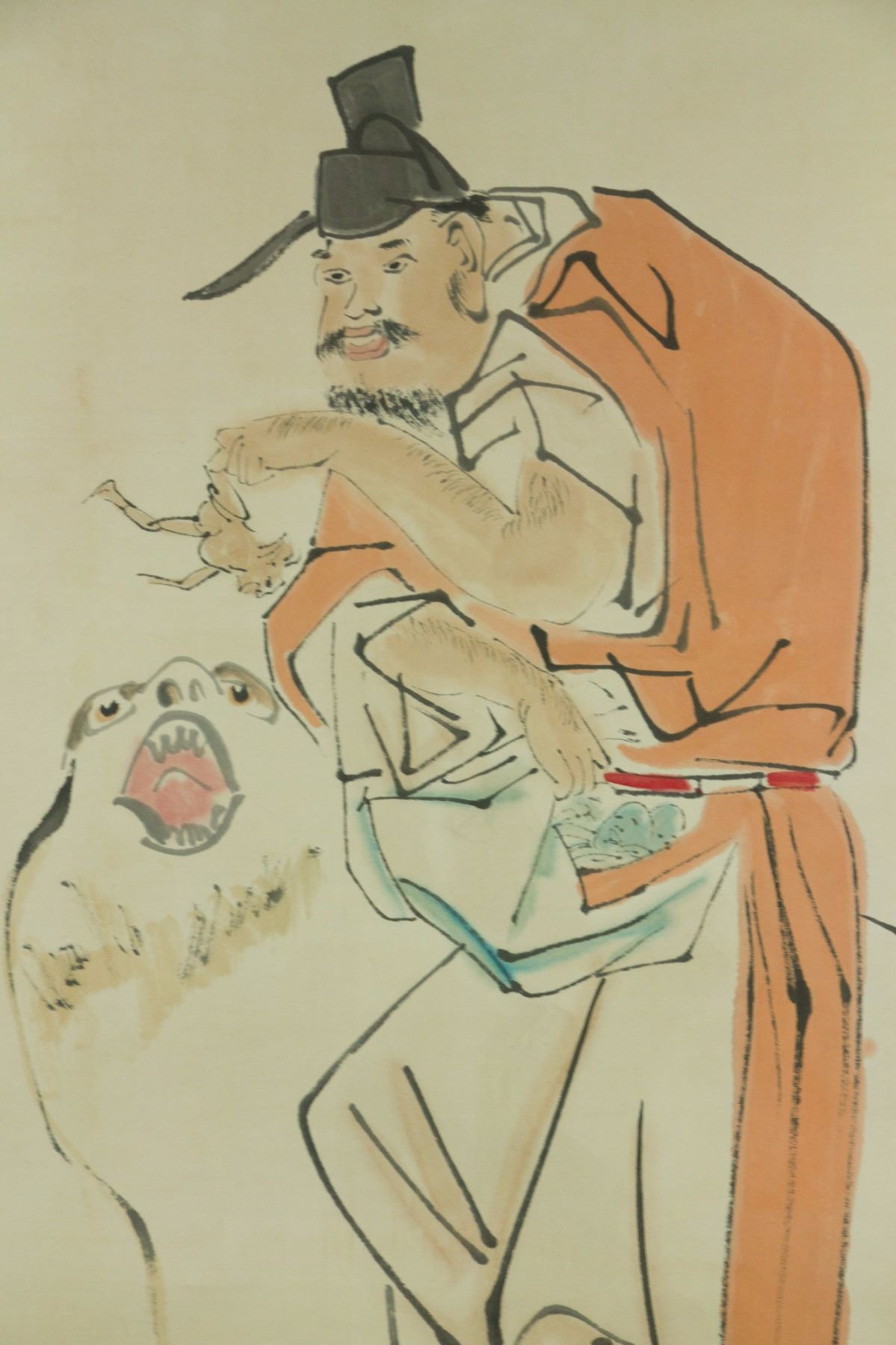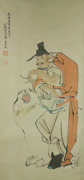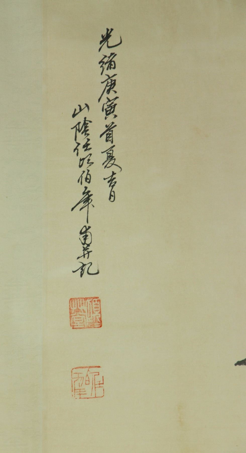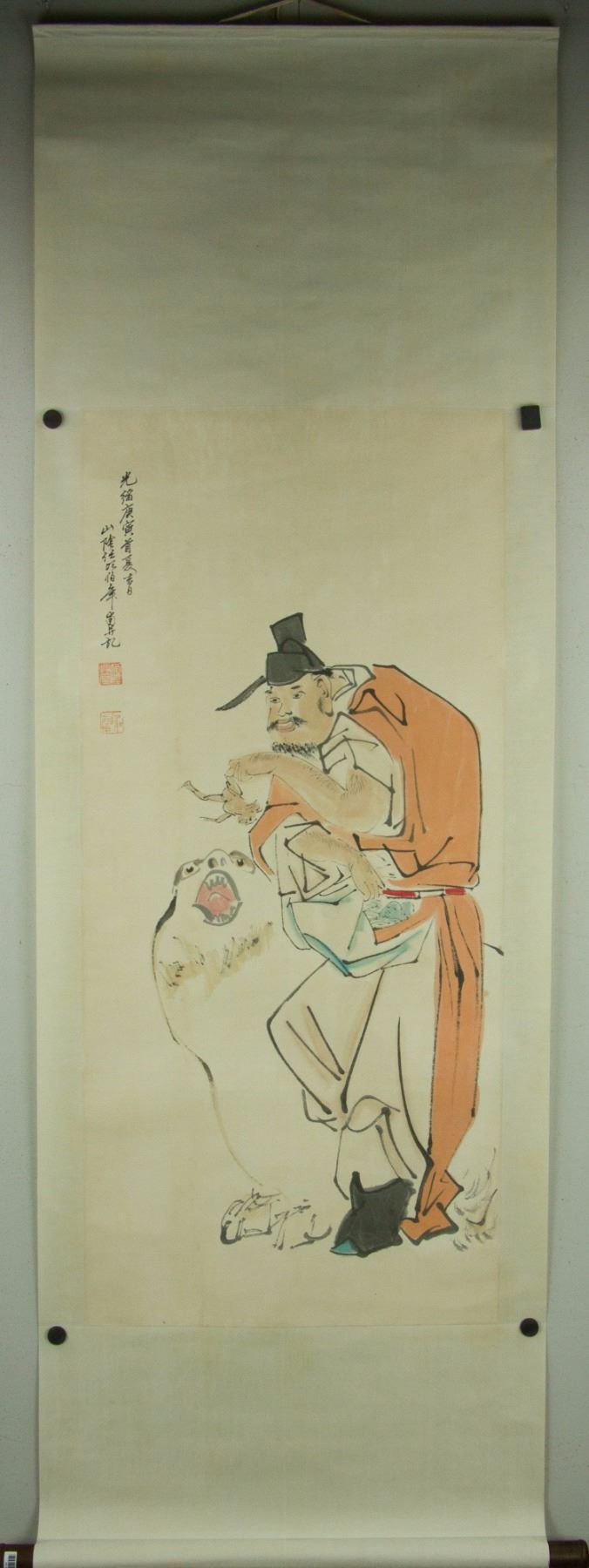 Scholar figures; Chinese ink and watercolour on paper; hanging scroll; signed Ren Bonian and inscribed with two artist seals; 158 cm × 54 cm