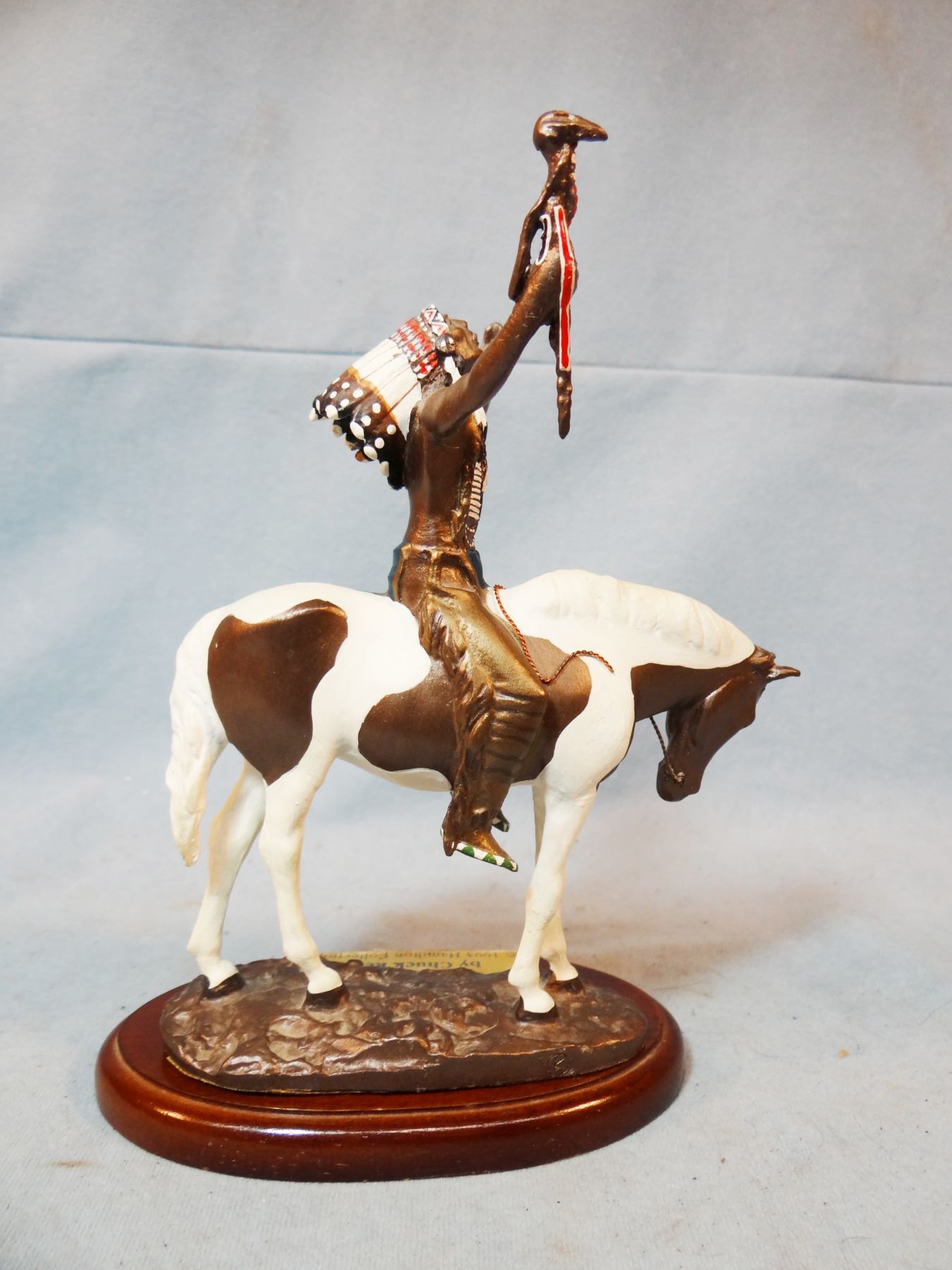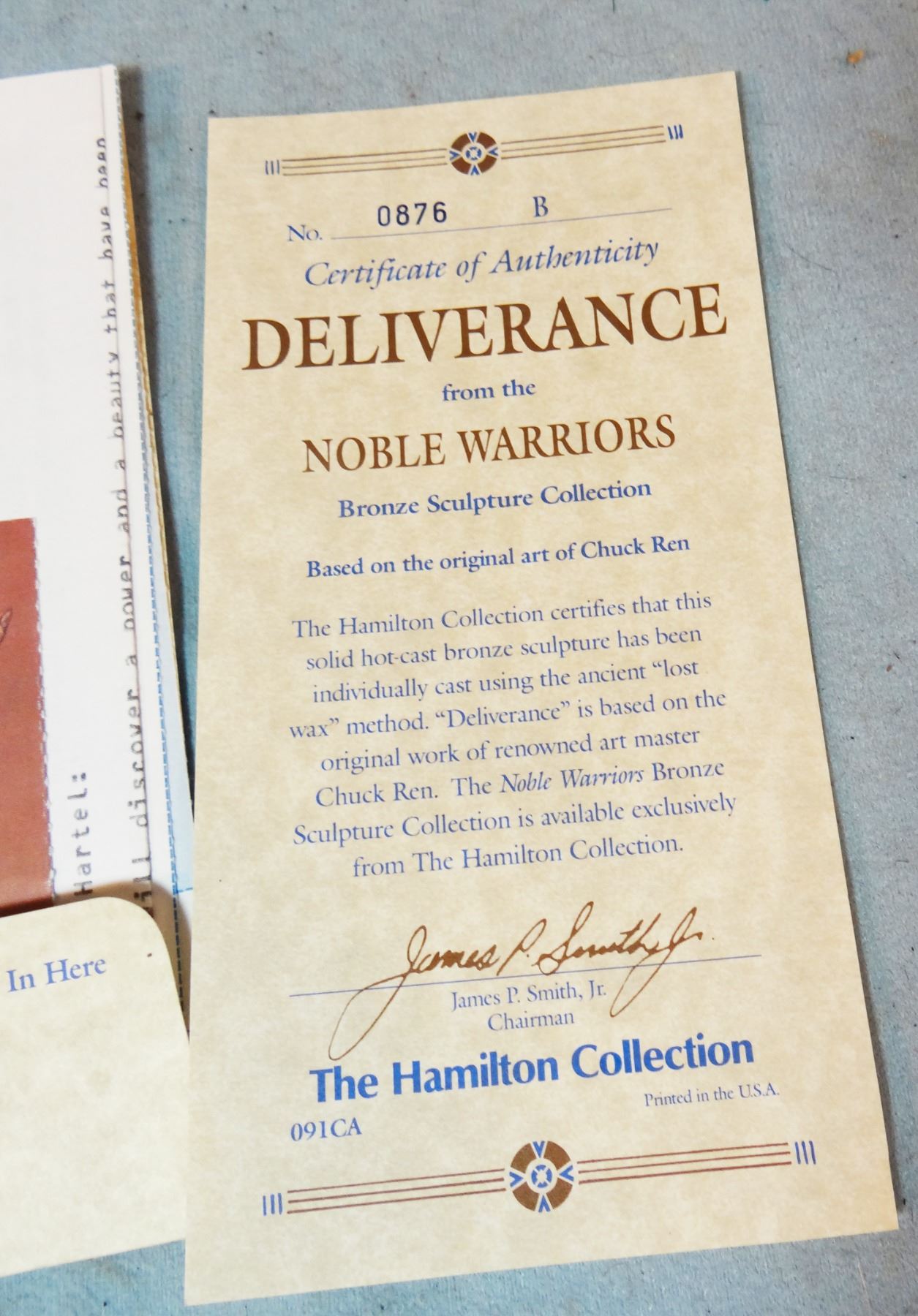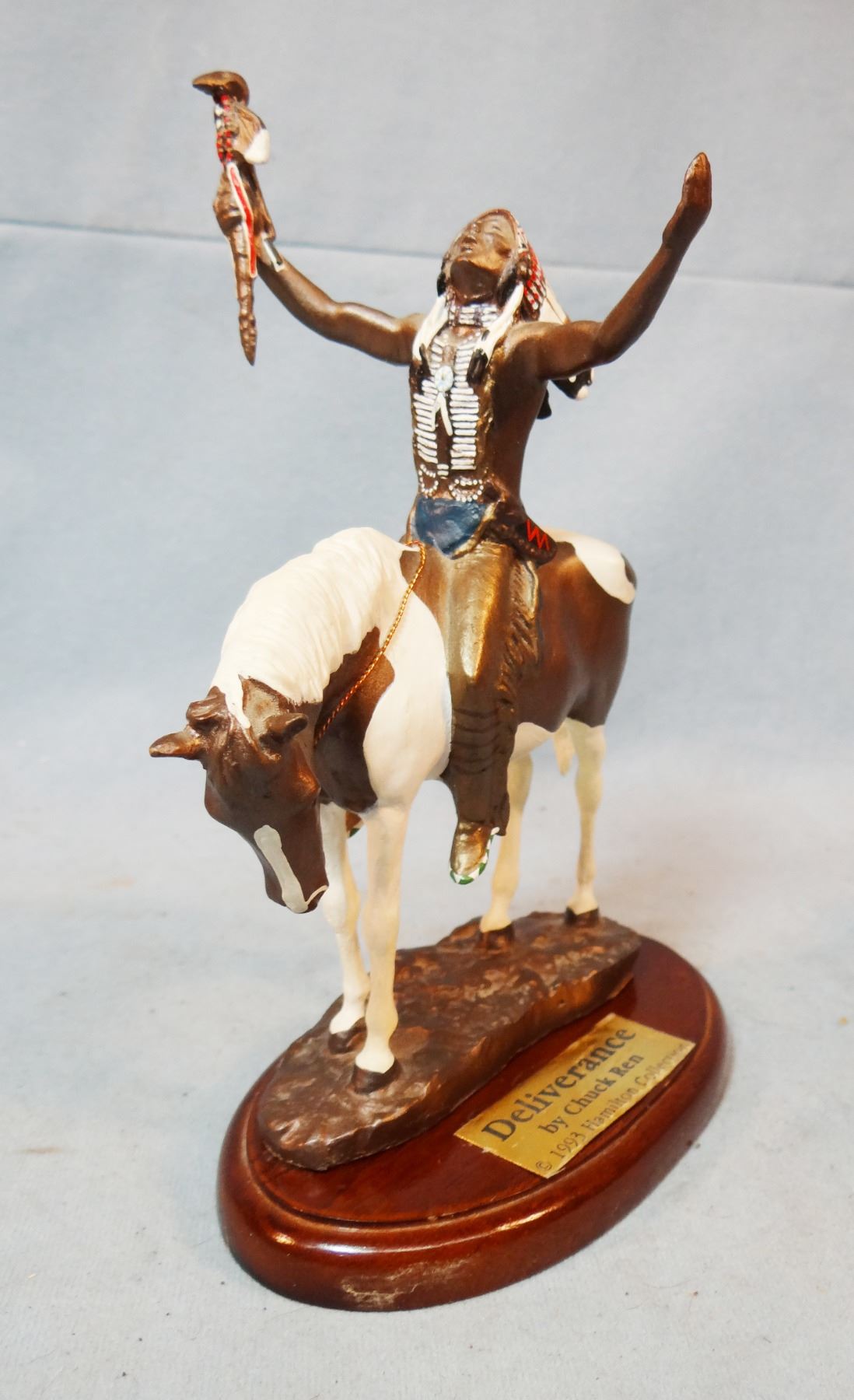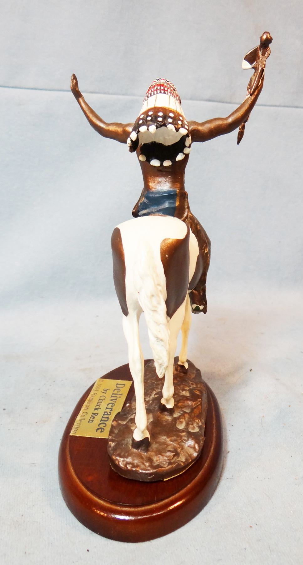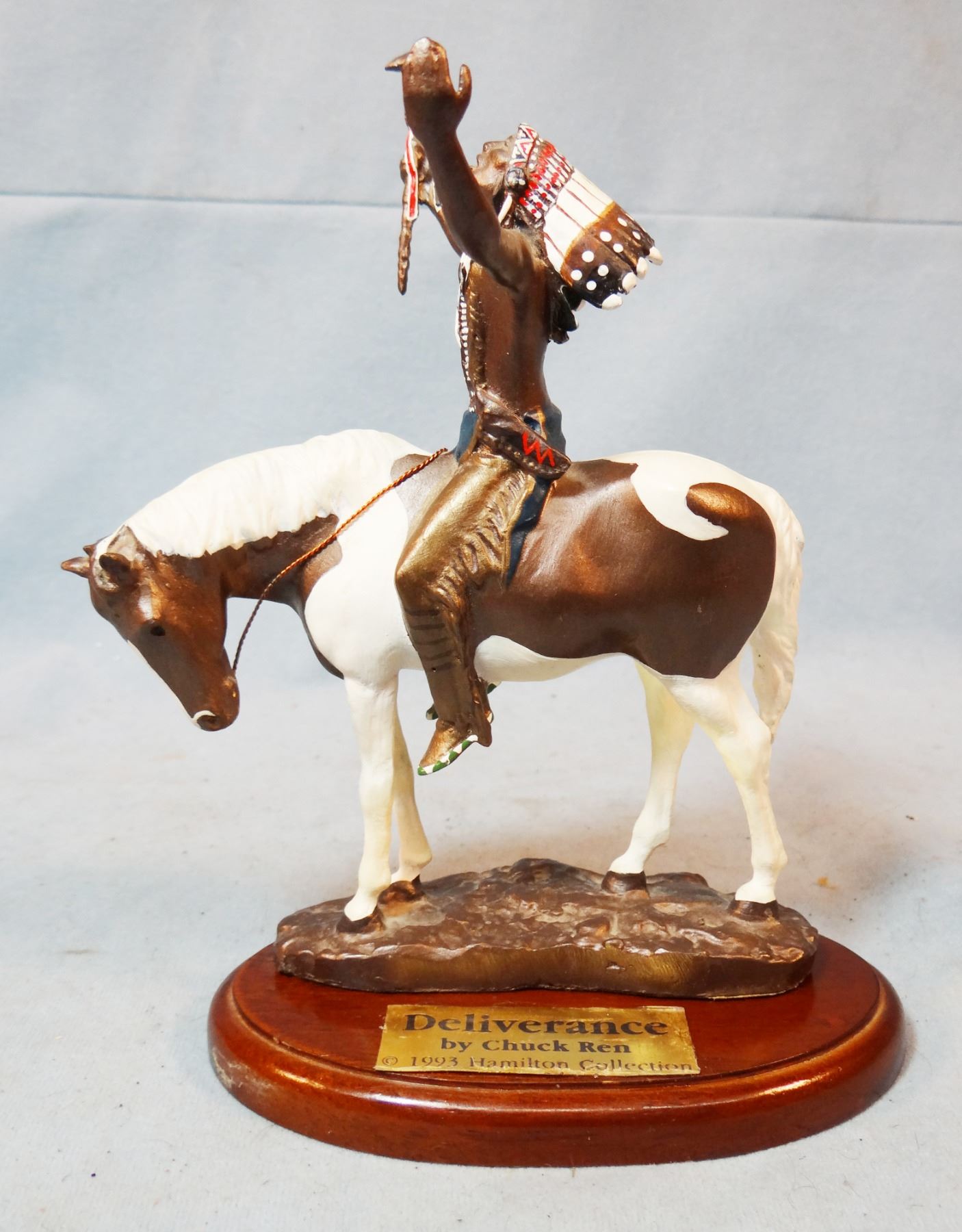 Ren, Chuck, reproduction bronze, Deliverance, No. 0876B, produced by The Hamilton Collection as part of the Noble Warrior Collection, 1993, 7 1/2" t x 6"w x 4" d, painted with a wood base