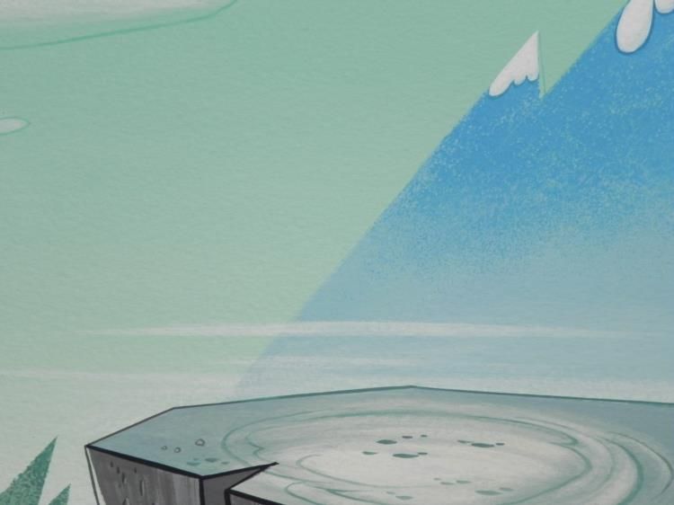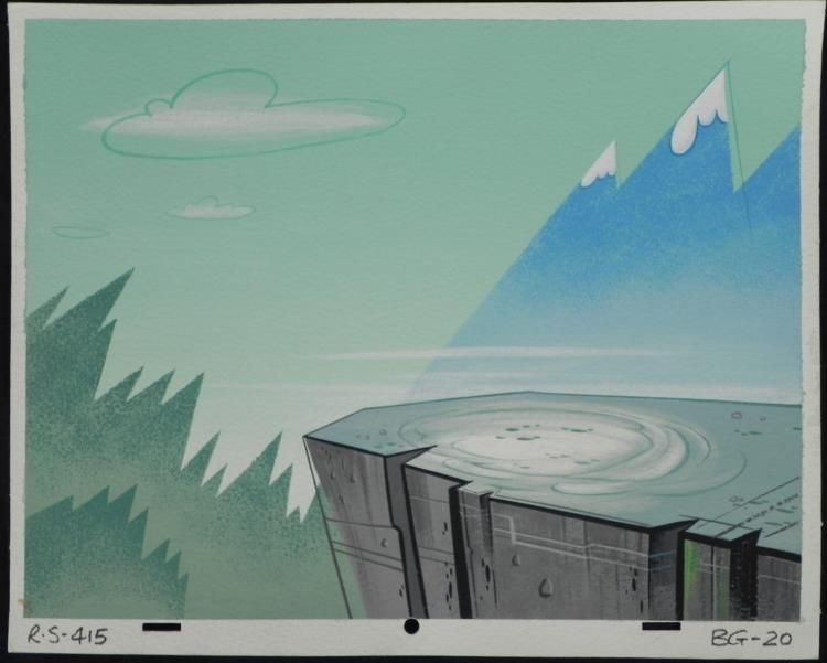 This original production background was done for The Ren & Stimpy Show. This scene is from Episode 68 entitled "Wiener Barons." This is a scenic overlook on a Canadian mountain landscape. Original hand painted production background, on heavy paper with pegholes and animator's notations at the lower margin Overall size is 10 1/2 x 12 3/4 inches Very good conditionOriginal Production Backgrounds are used in the making of the final version of animated productions. The background establishes the location and the overall good mood of the scenee. Typically, a background layout artist creates a drawing to establish the content of the scene, placement of characters, perspective and camera angle. Based on this drawing, the background artist creates a preliminary painting to confirm all of the scenes details, then the final production background which is used in the filming of the scene. When these backgrounds are individually photographed behind the progression of production cels, and projected at a rapid succession, the images in the foreground appear to move, creating an animated scene. This original painting is enough to make any Ren and Stimpy fan proud!