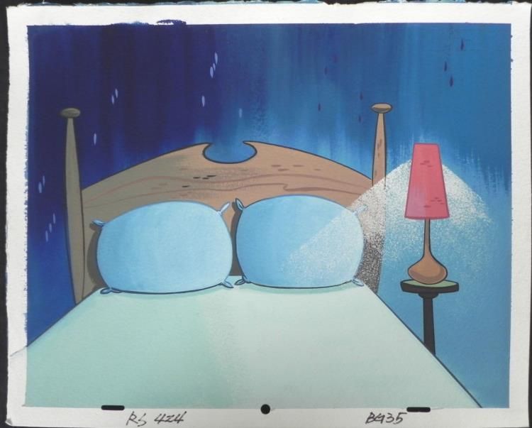 This original production background was done for The Ren & Stimpy Show. This scene shows a comfortable looking bed with light shining on the nightstand. Original hand painted production background, on heavy paper with pegholes and animator's notations