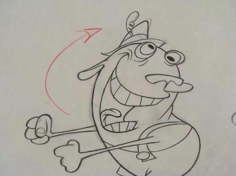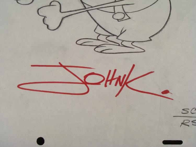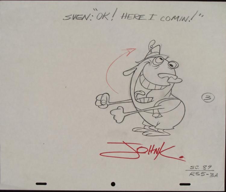 This is an original drawing used in 1992 production of the now classic, twisted animated series Ren & Stimpy. This features Ren's cousin Sven Hoek, with an arrow pointing out the action, and a speaking line. Best of all, it's signed by the show's creator, known in animation as "John K." * Animator: John KricfalusiSigned: In red marker, lower right Medium: Black pencil on animator's paper, with red pencil arrowSheet size:10 x 12 inchesDetails: Numbers at the bottom rightCondition: Excellent condition, with crease marks at the upper left and lower right