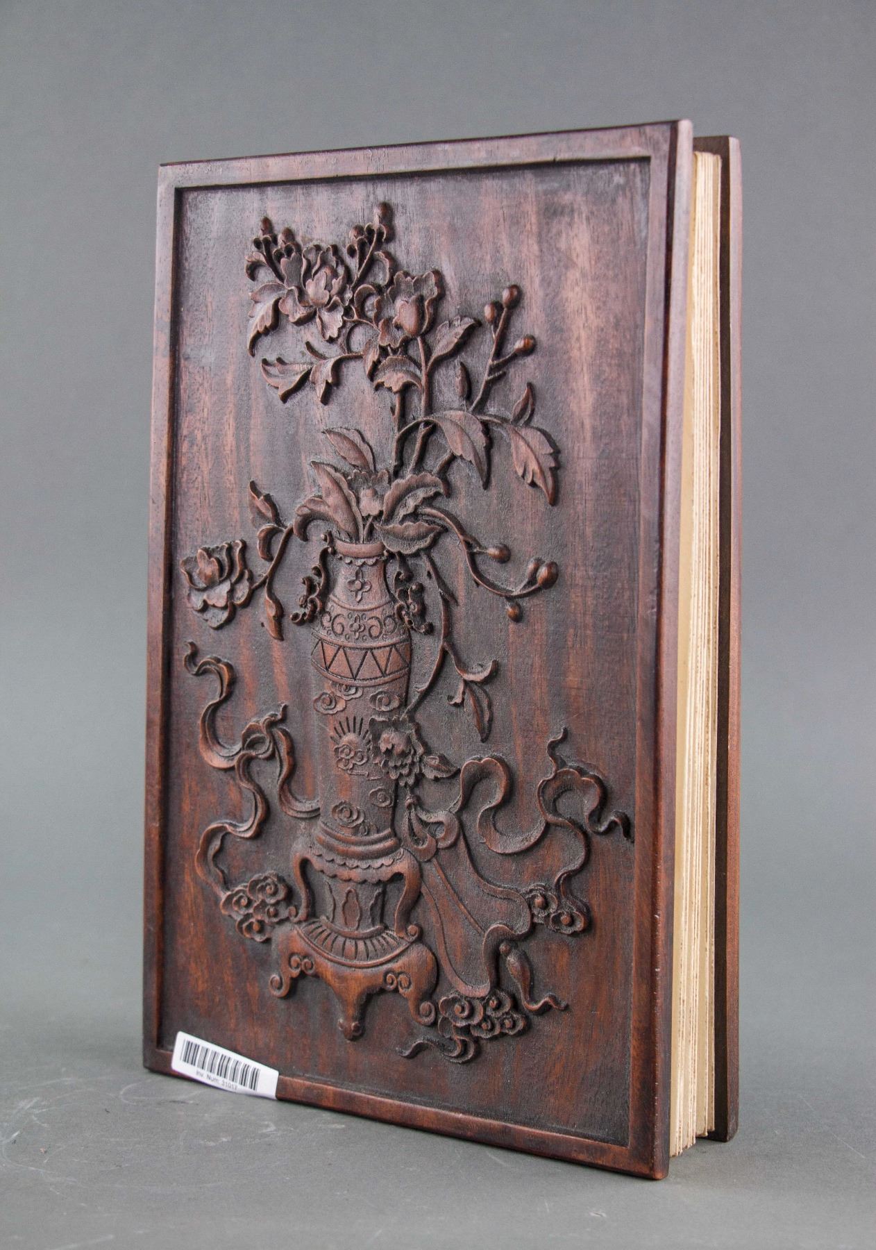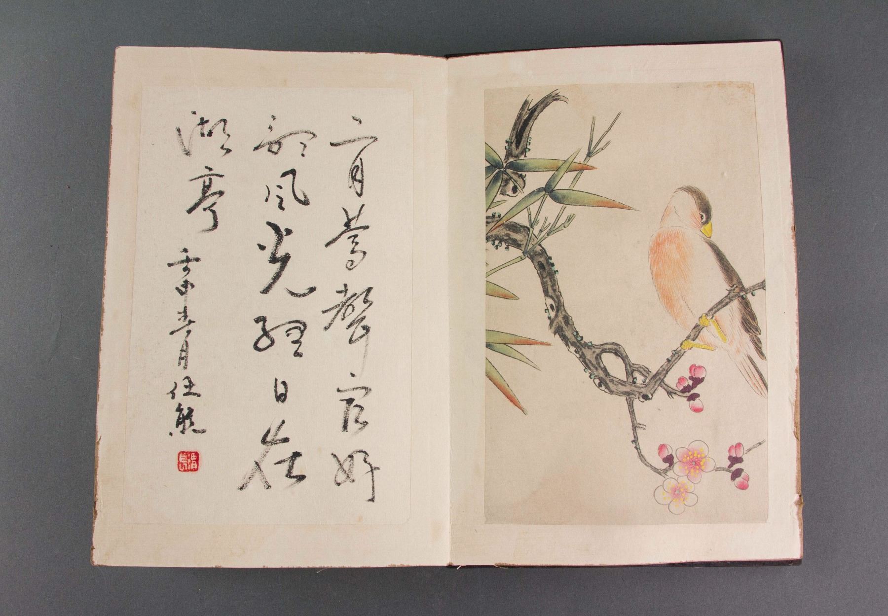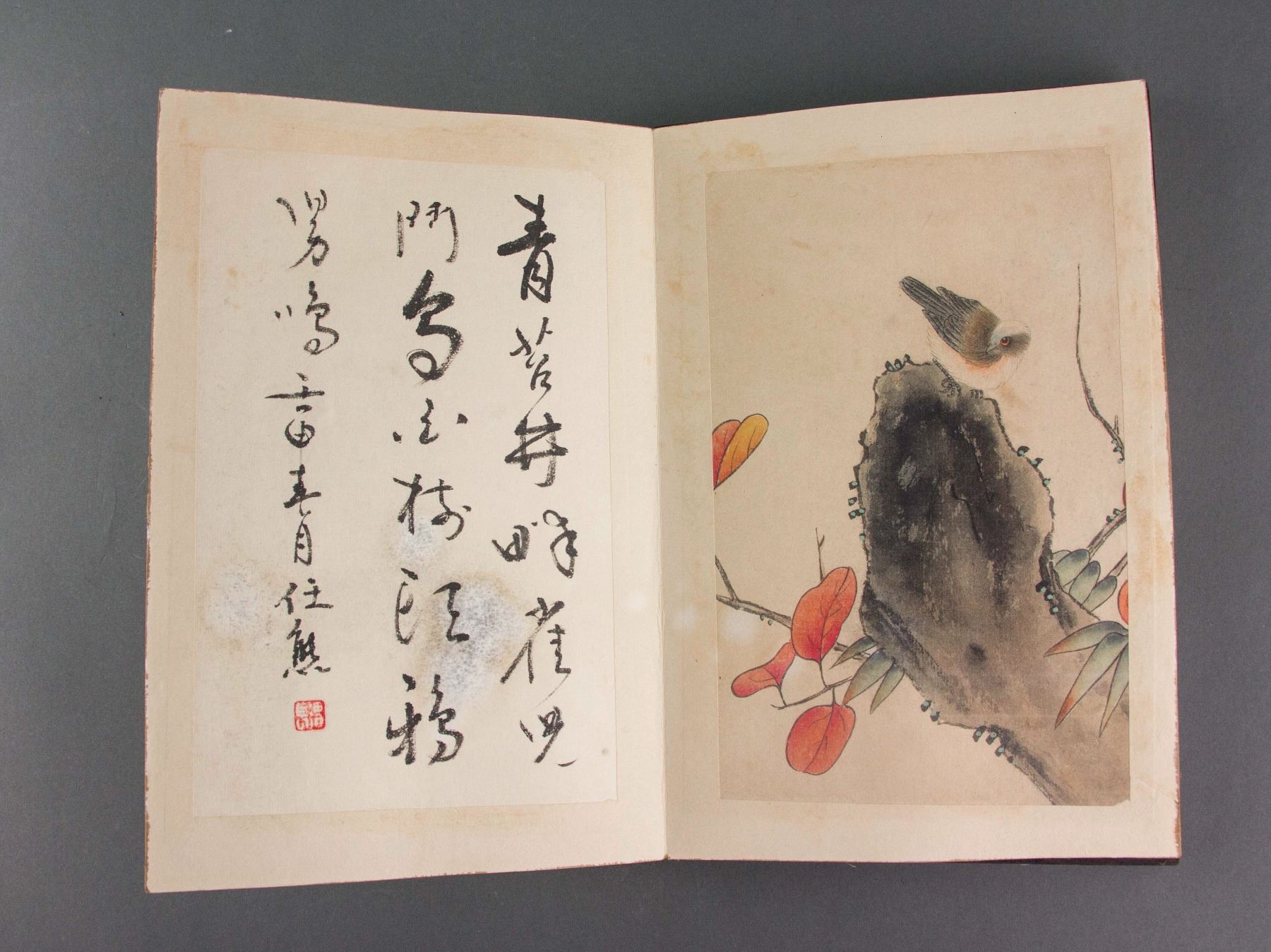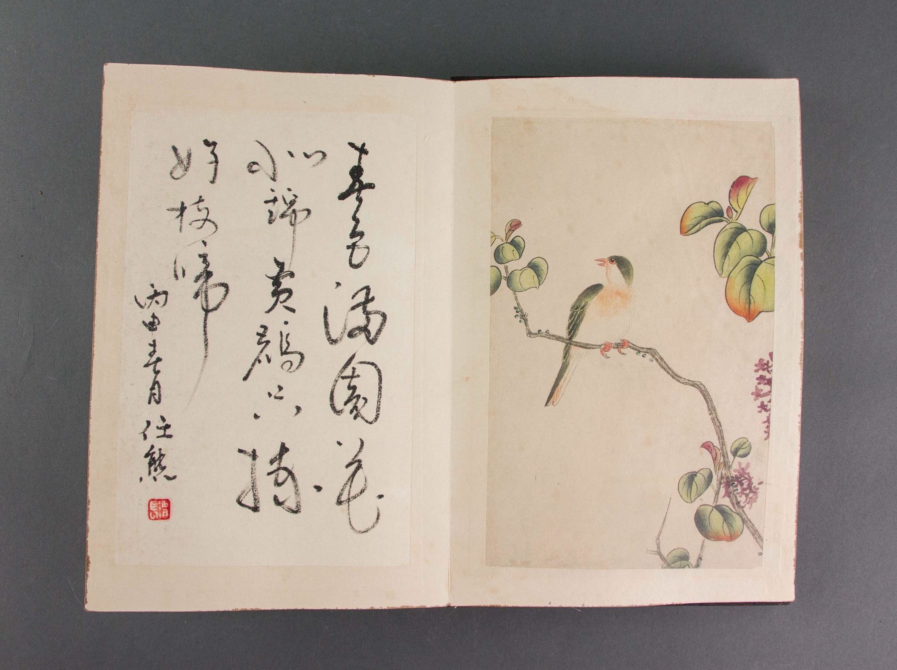 Six pieces of painting of birds, flowers and fruits; with six pieces of Chinese calligraphy in cursive script; Chinese ink and watercolour on paper; bind in booklet; with wood front and back cover; front cover carved with vase and flowers; signed Ren Xiong (1823-1857); inscribed with 6 artist seals; 30 cm x 20 cm, 1067 grams