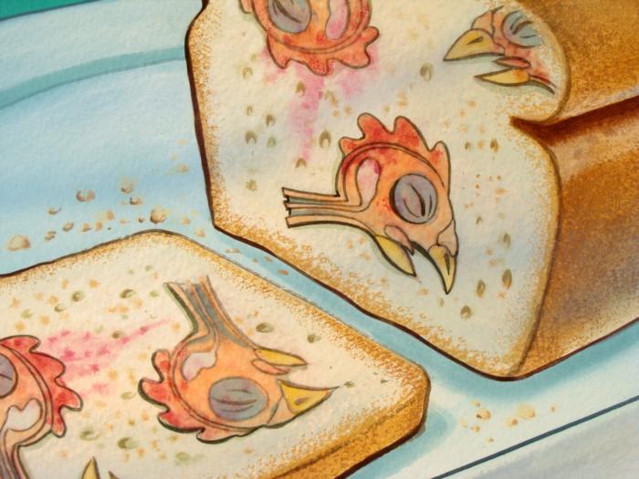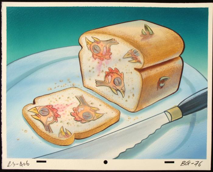 This original hand-painted background is from the Nickelodeon TV show Ren & Stimpy. The show follows two characters - Ren, a crazy Chihuahua - and - Stimpy, an incredibly stupid cat - as they think up to all kinds of hair brained schemes and get themselves into some sticky situations. The Ren and Stimpy Show debuted in August 1991 with a two-part episode, 'Stimpy's Big Day / The Big Shot' and became an instant hit. It was the third Nicktoon ever to be aired on the Network alongside Doug and Rugrats. There is this new food on the market called Chik Bread with whole style chicken heads. Don't get in over you head with this, there's plenty to go around. Original Production Background Overall Size: 10 1/2" x 13" Excellent condition Original Production Backgrounds are used in the making of the final version of animated productions. The background establishes the location and the overall good mood of the scenee. Typically, a background layout artist creates a drawing to establish the content of the scene, placement of characters, perspective and camera angle. Based on this drawing, the background artist creates a preliminary painting to confirm all of the scenes details, then the final production background which is used in the filming of the scene. When these backgrounds are individually photographed behind the progression of production cels, and projected at a rapid succession, the images in the foreground appear to move, creating an animated scene. The background is to be matted and framed. It is a colored background with the animator's notations shown at the bottom.